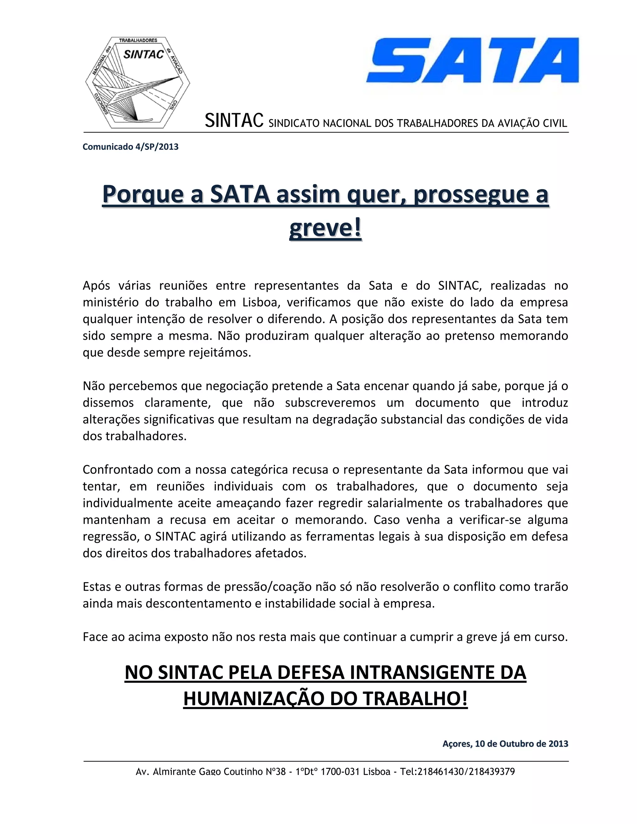 O sindicato SINTAC comunica que as negociações com a empresa Sata para resolver as diferenças salariais não tiveram sucesso, pois a Sata se recusa a alterar o memorando proposto que reduz substancialmente as condições dos trabalhadores. A Sata também ameaça reduzir salários individualmente de quem se recusar a aceitar o memorando. O SINTAC continuará a greve em curso para defender os direitos dos trabalhadores.