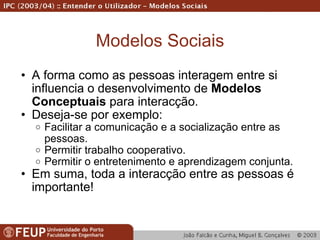 Modelos Sociais Aforma como as pessoas interagem entre si influencia o desenvolvimento de Modelos Conceptuais para interacção. Deseja-se por exemplo: Facilitar a comunicação e a socialização entre as pessoas. Permitir trabalho cooperativo. Permitir o entretenimento e aprendizagem conjunta. Em suma, toda a interacção entre as pessoas é importante!
