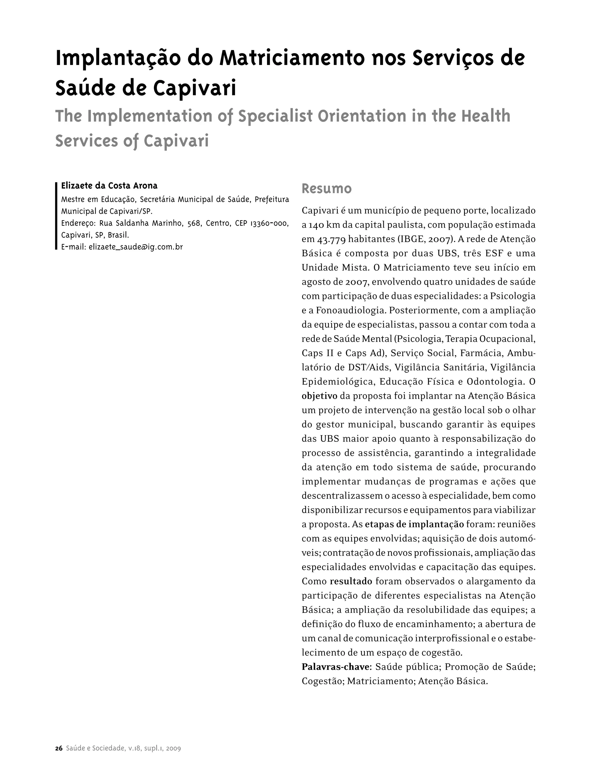 Este documento descreve a implementação do programa de matriciamento nos serviços de saúde de Capivari, Brasil. O programa teve início em 2007 envolvendo quatro unidades de saúde e duas especialidades. Posteriormente, mais especialidades foram incluídas. O objetivo foi melhorar o apoio às equipes de atenção básica e garantir a integralidade do cuidado à saúde. Como resultado, observou-se maior participação de especialistas na atenção básica e melhor resolubilidade das equipes.
