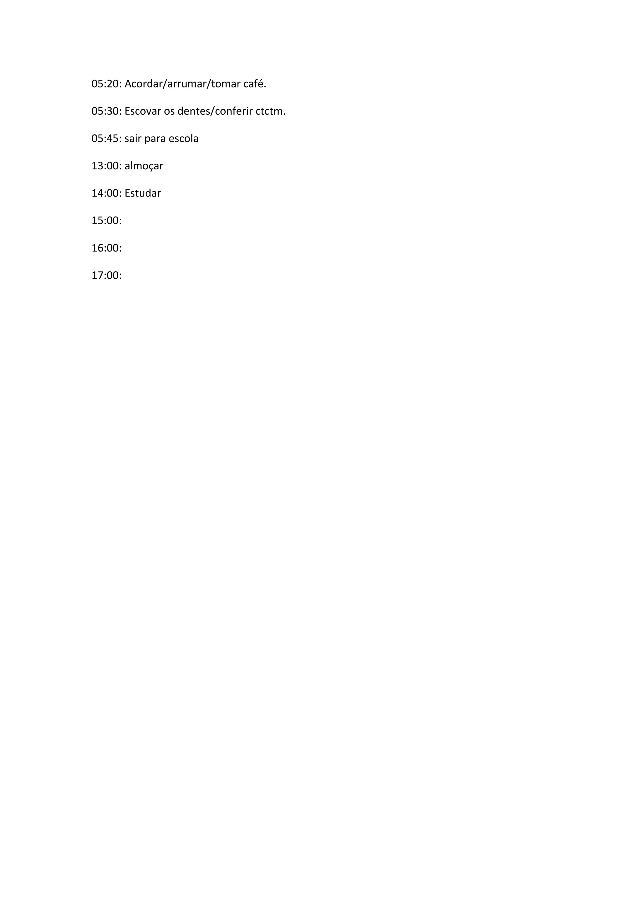 A rotina diária inclui acordar cedo, se arrumar, tomar café e escovar os dentes. Depois ir para a escola, almoçar e estudar durante a tarde, com algumas horas livres antes do fim do dia.