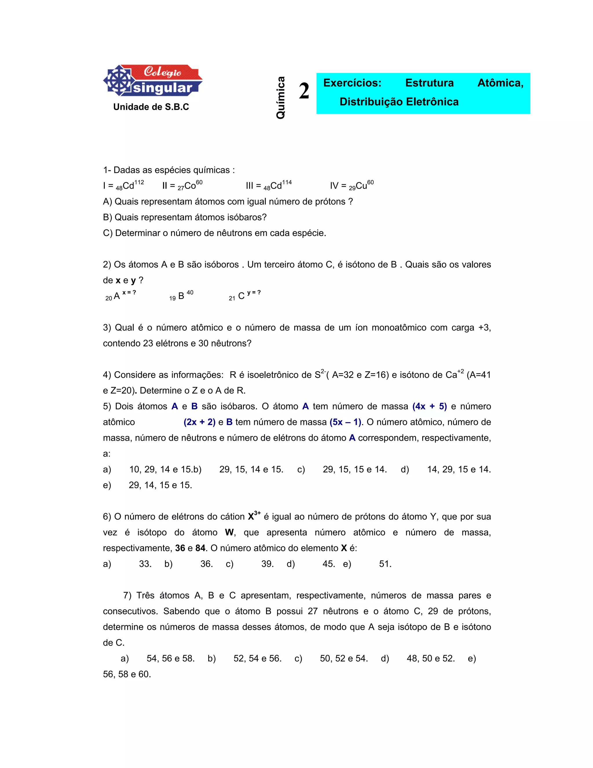 1) O documento apresenta uma série de exercícios sobre estrutura atômica e distribuição eletrônica. 2) Os exercícios envolvem conceitos como átomos isóbaros, isótopos e isótons. 3) São solicitadas informações como número atômico, número de massa, número de prótons, nêutrons e elétrons de diferentes átomos e íons.
