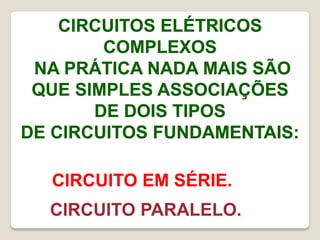 O documento descreve os circuitos elétricos série e paralelo. Nos circuitos série, a corrente é a mesma em todas as resistências e a tensão se divide entre elas. Nos circuitos paralelo, a tensão é a mesma e a corrente se divide entre as resistências. O documento fornece fórmulas para calcular a resistência equivalente em circuitos série, paralelo e mistos.