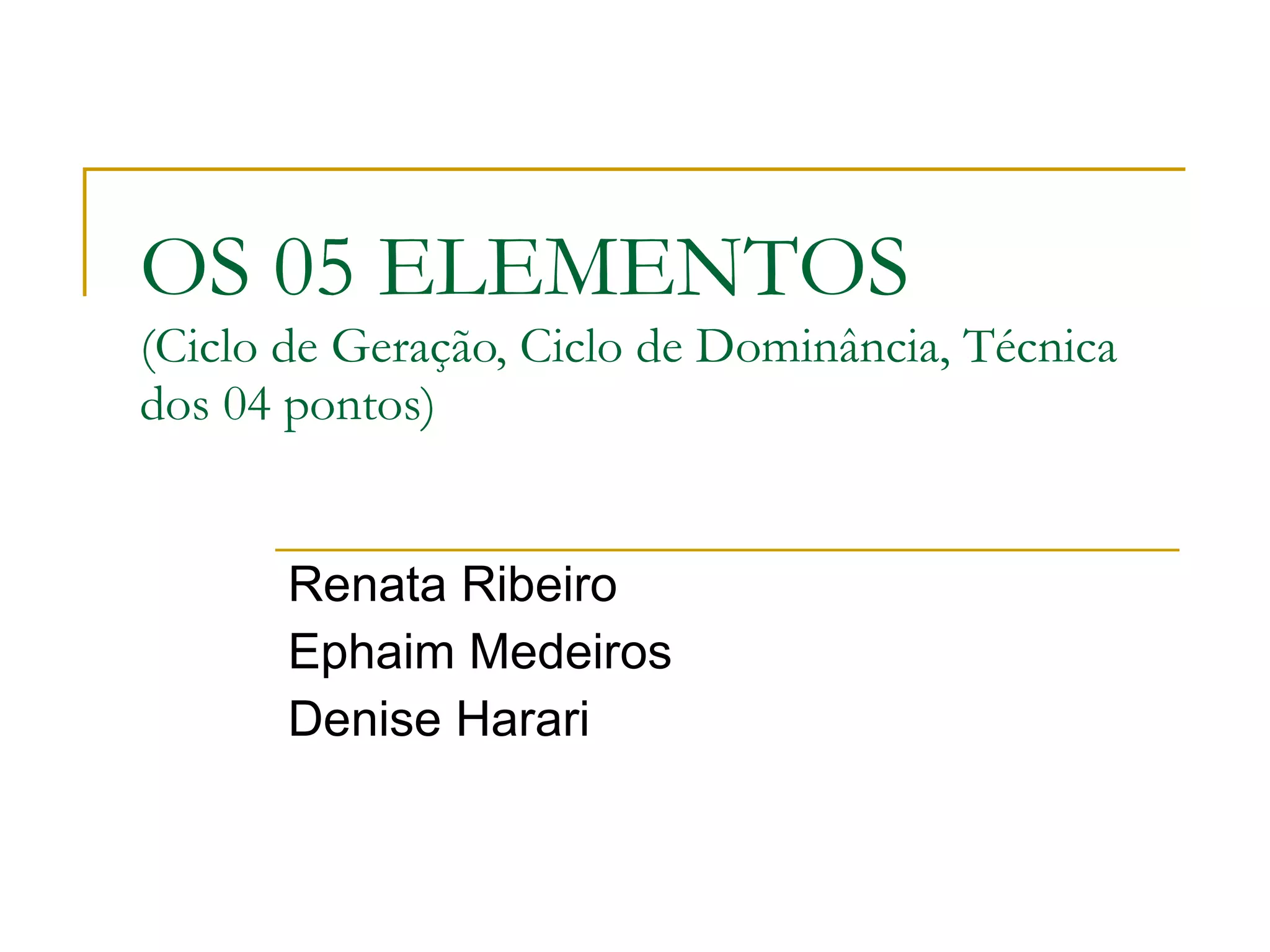 1) O documento descreve os cinco elementos da medicina tradicional chinesa - Água, Madeira, Fogo, Terra e Metal - e suas associações com estações do ano, órgãos e aspectos da mente.