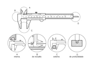 O documento descreve como usar um paquímetro para medir diâmetros de engrenagens de forma precisa. Ele explica como posicionar corretamente o paquímetro na altura do dente e apoiá-lo na peça para garantir uma medição exata do diâmetro de referência. Também destaca a importância de manter os encostos do paquímetro limpos e posicionar corretamente a peça entre eles.