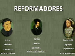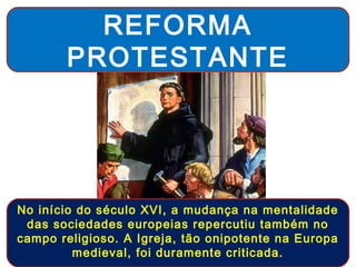 A Reforma Protestante iniciou no século XVI com críticas à Igreja Católica e tentativas de reforma, culminando na divisão do cristianismo em várias igrejas como a Luterana e a Calvinista. A Contrarreforma Católica respondeu com medidas como o Concílio de Trento para reafirmar seus dogmas e combater a disseminação das novas doutrinas.