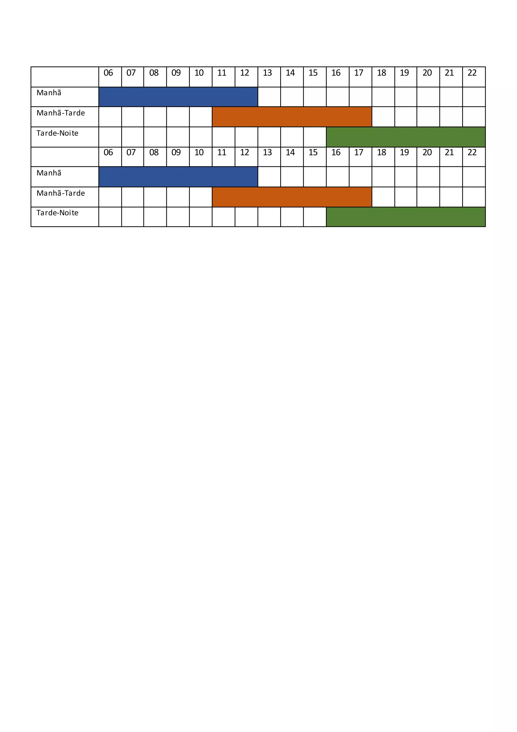 O documento apresenta uma tabela com horários divididos em manhã, manhã-tarde e tarde-noite nas linhas, com os números de 06 a 22 nas colunas, repetindo o padrão duas vezes.