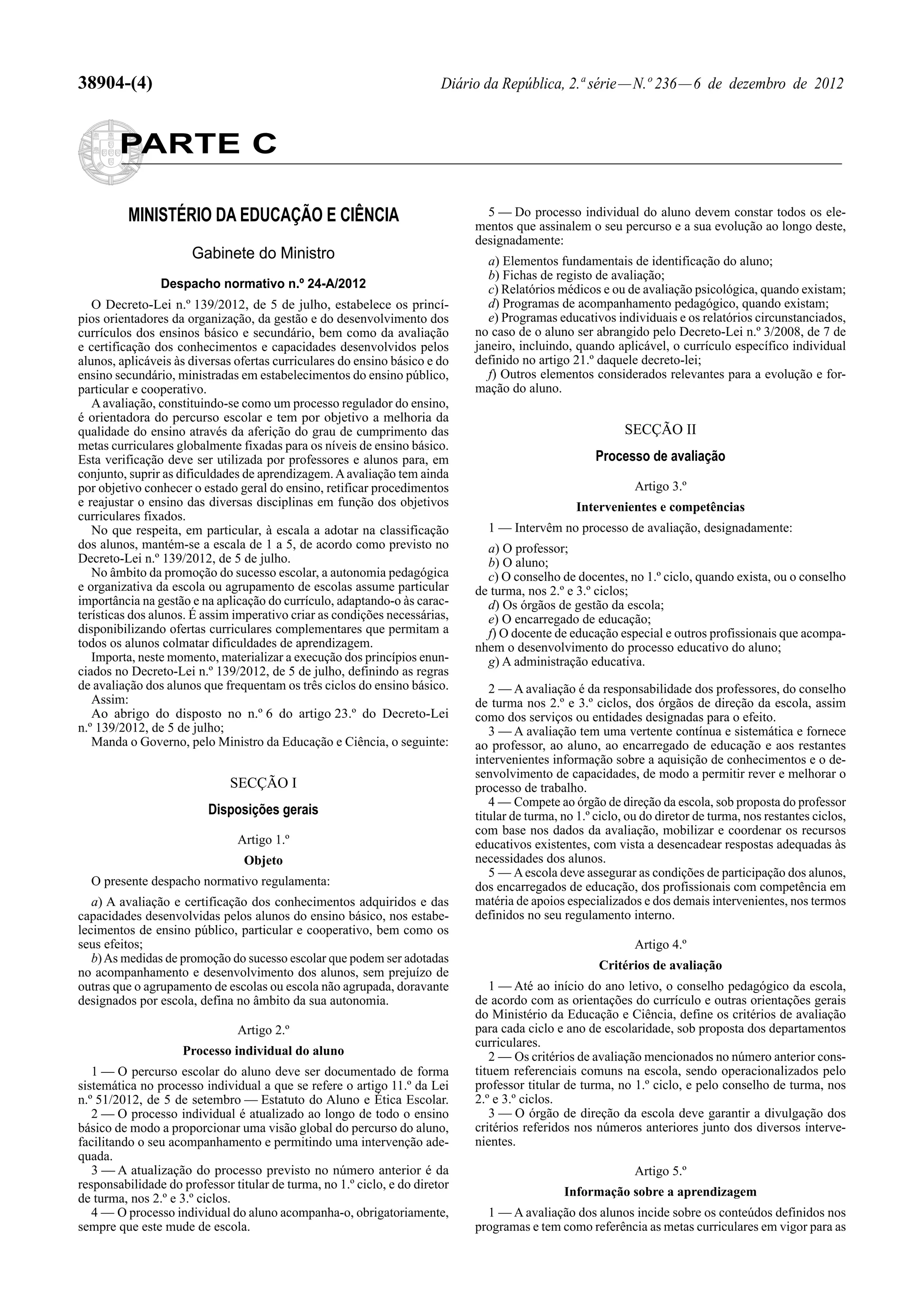 1) O documento regulamenta a avaliação e certificação dos alunos do ensino básico, definindo as regras de avaliação sumativa interna e externa.