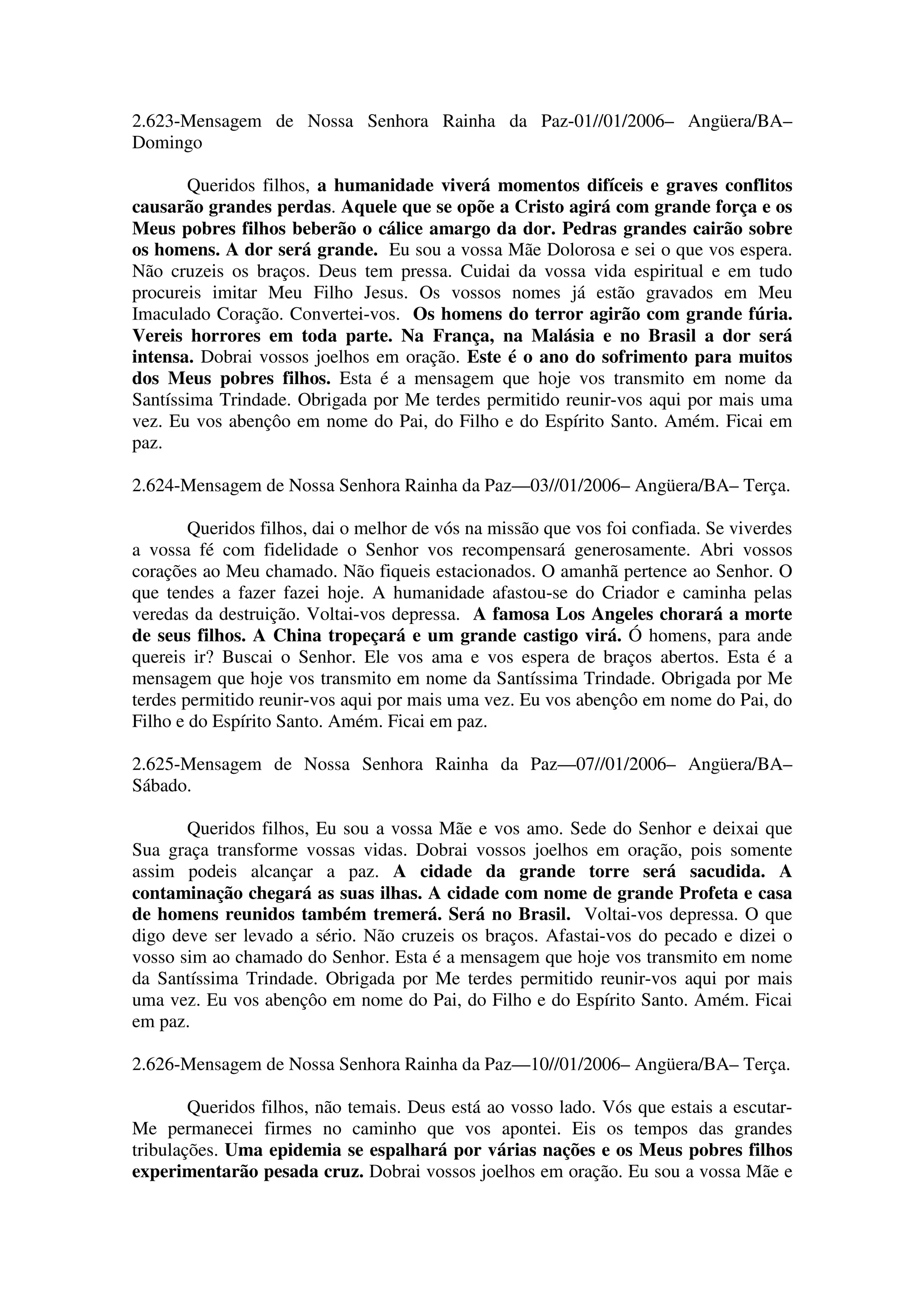 Nas mensagens, Nossa Senhora alerta sobre momentos difíceis e conflitos que trarão grandes perdas para a humanidade. Ela pede aos fiéis que intensifiquem a oração, se convertam do pecado e sigam o exemplo de Jesus, pois virão grandes tribulações, desastres naturais e sofrimentos para muitas nações. Nossa Senhora também faz previsões específicas sobre desastres que ocorrerão em diversas cidades e países.