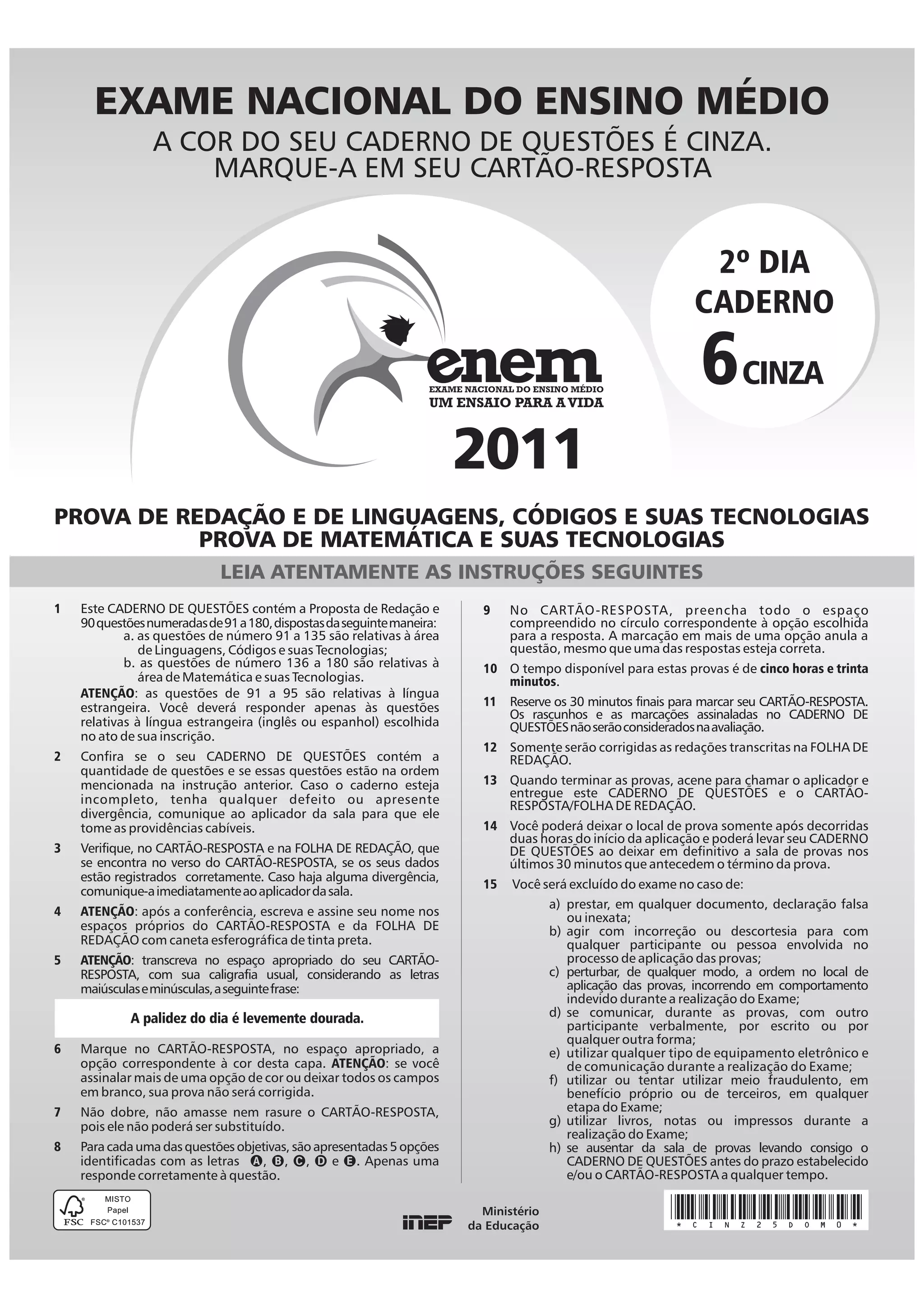 O documento apresenta as instruções para a realização da prova do Exame Nacional do Ensino Médio, incluindo informações sobre o caderno de questões, o cartão-resposta, a folha de redação e o tempo disponível para a realização das provas. Também destaca os itens que podem levar à exclusão do candidato do exame.