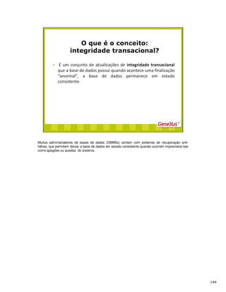Os sistemas de recuperação anti-falhas permitem deixar a base de dados consistente após imprevistos. As transações permitem estabelecer Unidades Lógicas de Trabalho (UTLs) que garantem a integridade dos dados. O GeneXus inclui o comando COMMIT nas transações e procedimentos para definir as UTLs nos ambientes cliente-servidor, assegurando a integridade dos dados.