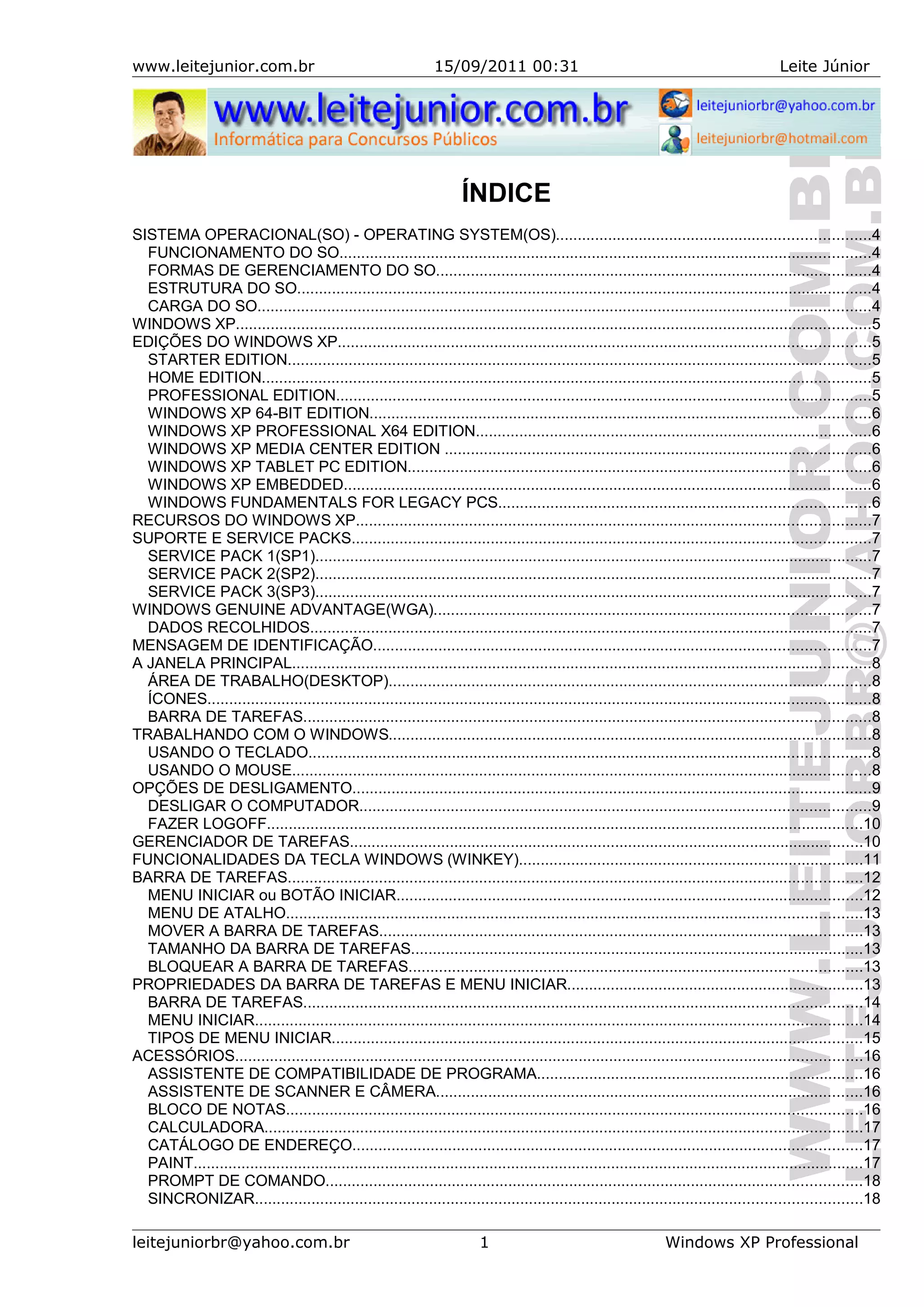 Este documento fornece um guia sobre o sistema operacional Windows XP. Ele descreve as principais edições do Windows XP, recursos, suporte técnico, a janela principal e como usar o mouse e teclado. Além disso, lista e explica brevemente vários aplicativos incluídos no Windows XP, como o Bloco de Notas, Paint e Calculadora.