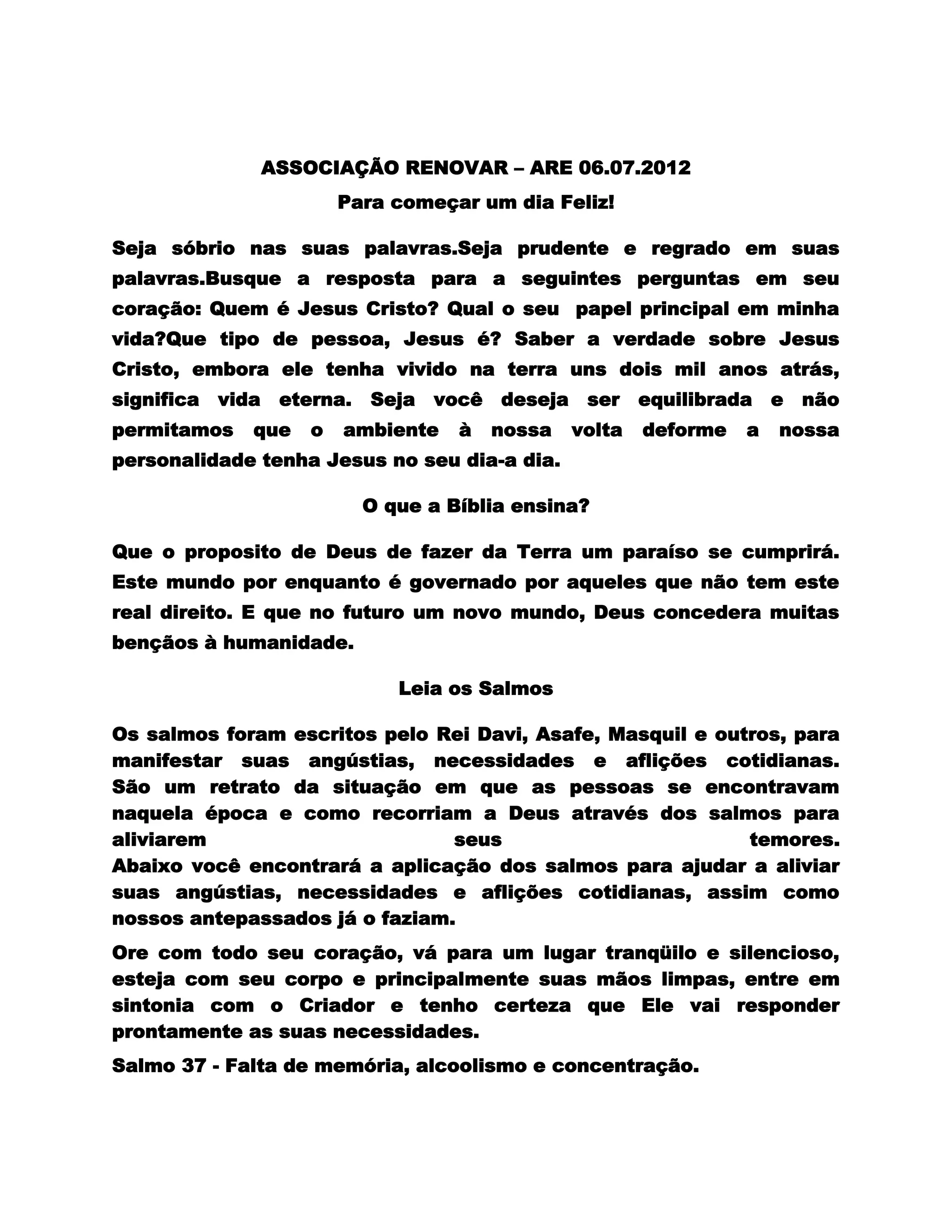 O documento discute a importância de Jesus Cristo na vida das pessoas e ensina que o propósito de Deus é criar um paraíso na Terra. Ele também fornece instruções sobre como rezar o Salmo 37 para superar problemas como falta de memória e concentração. Finalmente, discute a importância do dízimo para apoiar o trabalho da igreja.