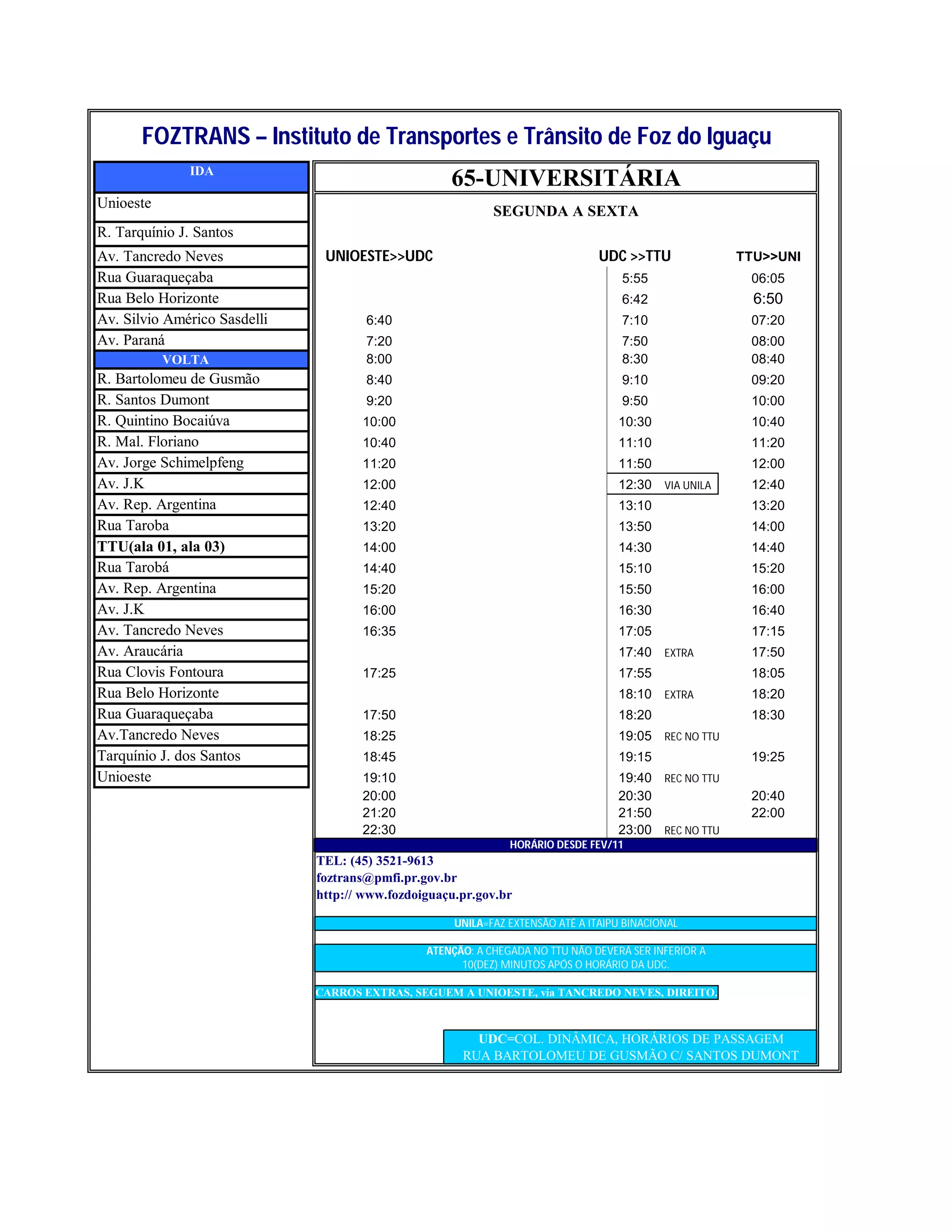 Este documento fornece o horário de uma linha de ônibus que faz o trajeto entre a Universidade Estadual do Oeste do Paraná (Unioeste) e o Terminal de Transporte Urbano (TTU) em Foz do Iguaçu, Brasil, com paradas em vários pontos ao longo do caminho. O horário inclui ida, volta e horários extras.
