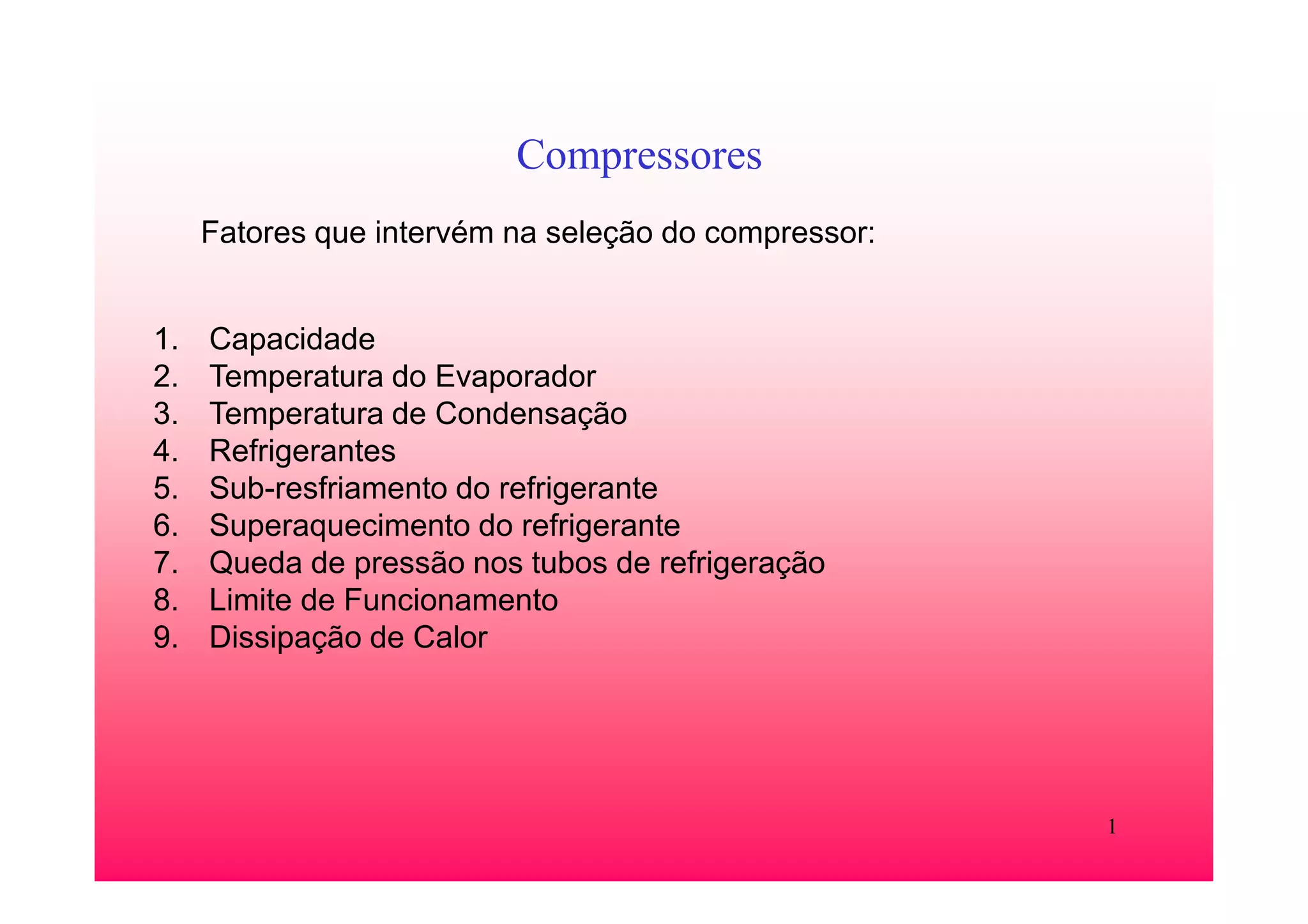 O documento discute os principais fatores a serem considerados na seleção de compressores para sistemas de refrigeração, incluindo capacidade, temperaturas de evaporação e condensação, refrigerantes, sub-resfriamento e superaquecimento do refrigerante. Além disso, aborda os diferentes tipos de compressores como recíprocos, parafusos e centrífugos, suas características de funcionamento e controle de capacidade.