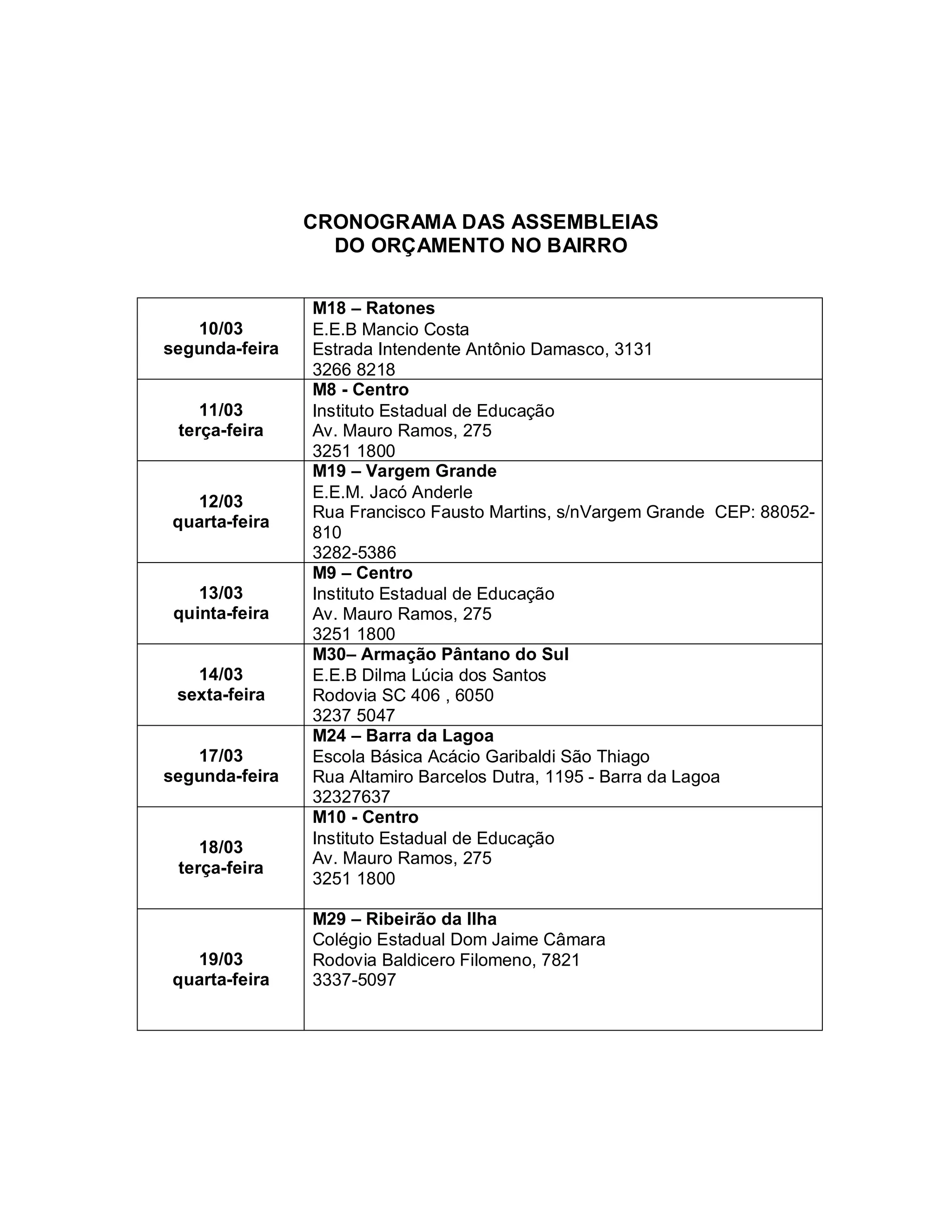 O documento apresenta o cronograma de assembleias do orçamento no bairro ao longo de março e abril, com a data, local e contato de cada assembleia para as microrregiões de Florianópolis. São listadas 27 microrregiões com detalhes sobre a localização e contato das escolas e instituições que sediarão cada assembleia.