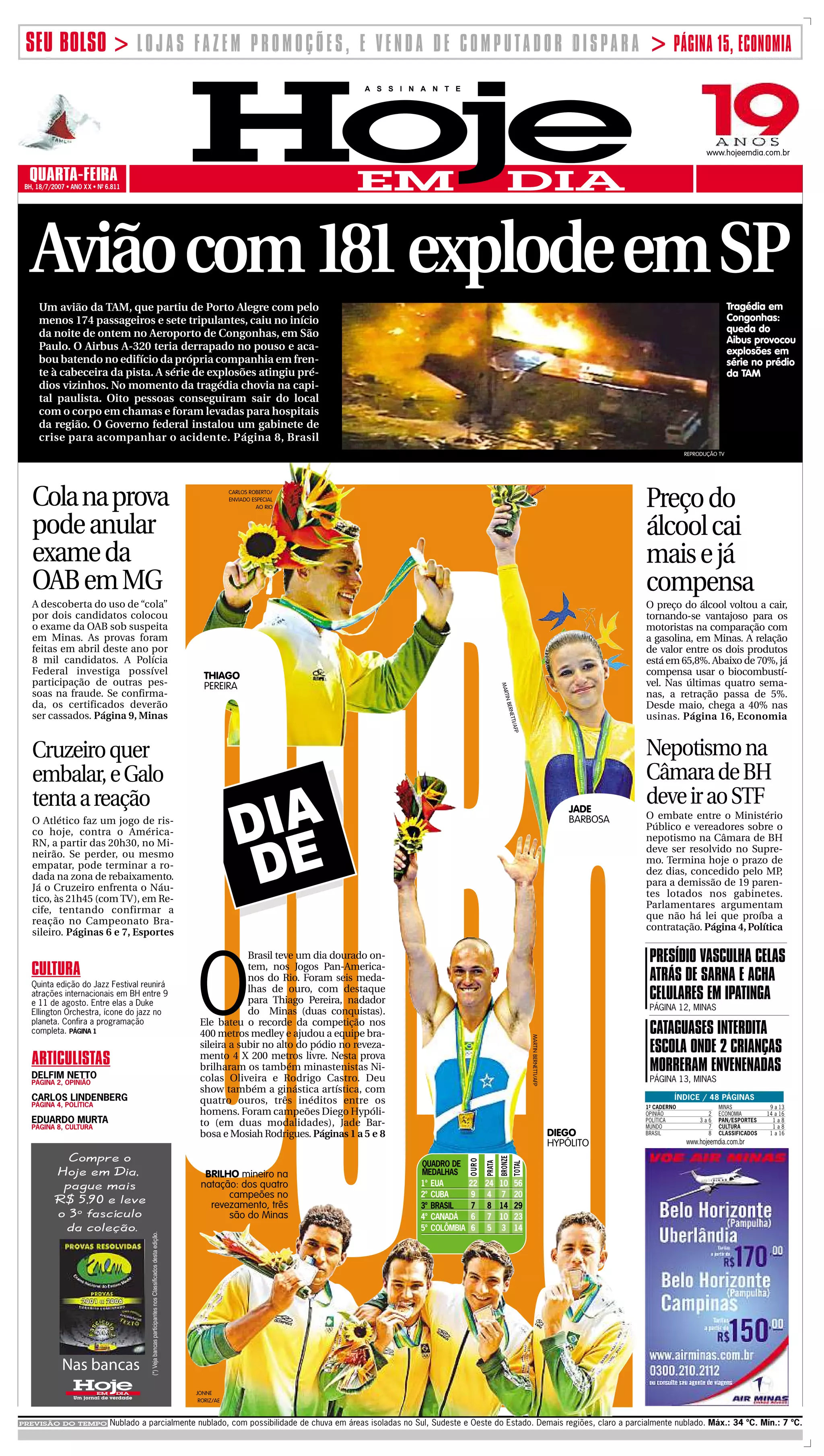 1) Um avião da TAM caiu ao tentar pousar no aeroporto de Congonhas em São Paulo, atingindo o prédio da companhia aérea e causando uma série de explosões;