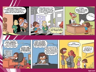 Este documento discute vários riscos associados ao uso da internet, incluindo a exposição de crianças a conteúdo inapropriado, mensagens enganosas por e-mail, perigos de phishing e roubo de identidade em telefones celulares, compartilhamento excessivo de informações pessoais em redes sociais, danos causados por vírus de computador, e propagação de vírus através de anexos de e-mail.