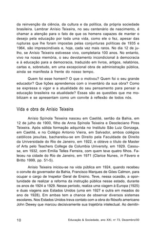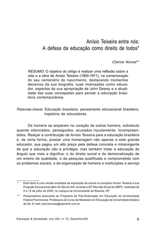 1) O artigo discute a vida e obra do educador brasileiro Anísio Teixeira, destacando seu papel na defesa da educação como um direito de todos.