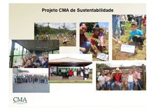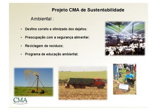 O documento apresenta um resumo da história e operações da CMA, uma empresa de confinamento bovino. A empresa começou no cultivo de laranjas e cana-de-açúcar em 1949 e, nas últimas décadas, expandiu para o confinamento de gado, produção de ração e parceria com frigoríficos. A CMA opera com foco em sustentabilidade, bem-estar animal e gestão eficiente.