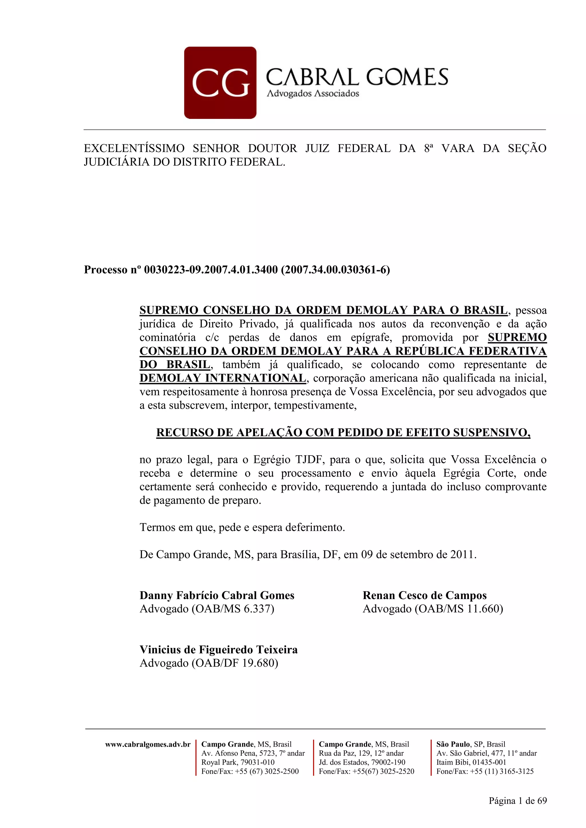 O documento descreve um recurso de apelação interposto pelo Supremo Conselho da Ordem Demolay para o Brasil contra decisão judicial que julgou parcialmente procedente ação movida pelo Supremo Conselho da Ordem Demolay para a República Federativa do Brasil. O recurso defende que o registro das marcas Demolay pertence legitimamente ao apelante e não houve fundamento legal para a decisão de nulidade dos registros e condenação ao pagamento de indenização.