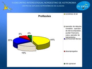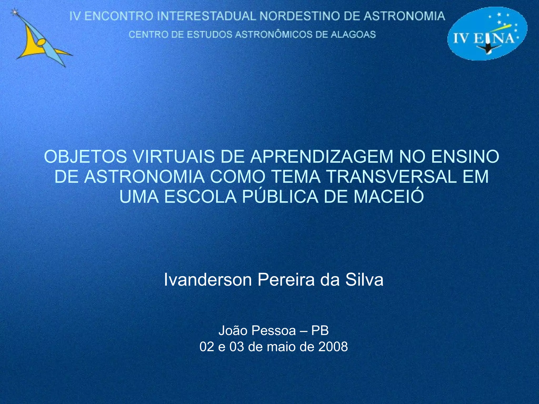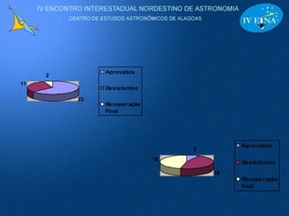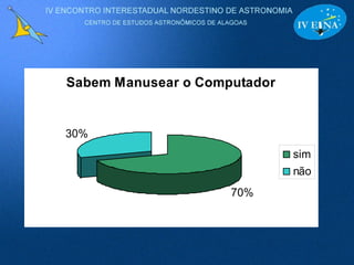 Este documento discute o uso de Objetos Virtuais de Aprendizagem (OVA) no ensino de astronomia para turmas do ensino médio noturno em uma escola pública em Maceió, Brasil. O objetivo era testar a eficácia dos OVA para melhorar a aprendizagem dos alunos sobre física. Os alunos, com idades entre 17-41 anos, usaram OVA por 8 horas sobre dois dias. A maioria dos alunos que usaram os OVA foi aprovada, em comparação com apenas um dos alunos que não