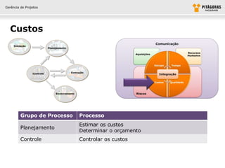 O documento discute os processos e técnicas de gerenciamento de custos em projetos. Estes incluem estimar custos, determinar o orçamento e controlar os custos por meio de ferramentas como análise de valor, estimativas, gestão de reservas e valor agregado. O documento fornece detalhes sobre como aplicar essas técnicas para planejar, monitorar e controlar os custos ao longo do ciclo de vida de um projeto.