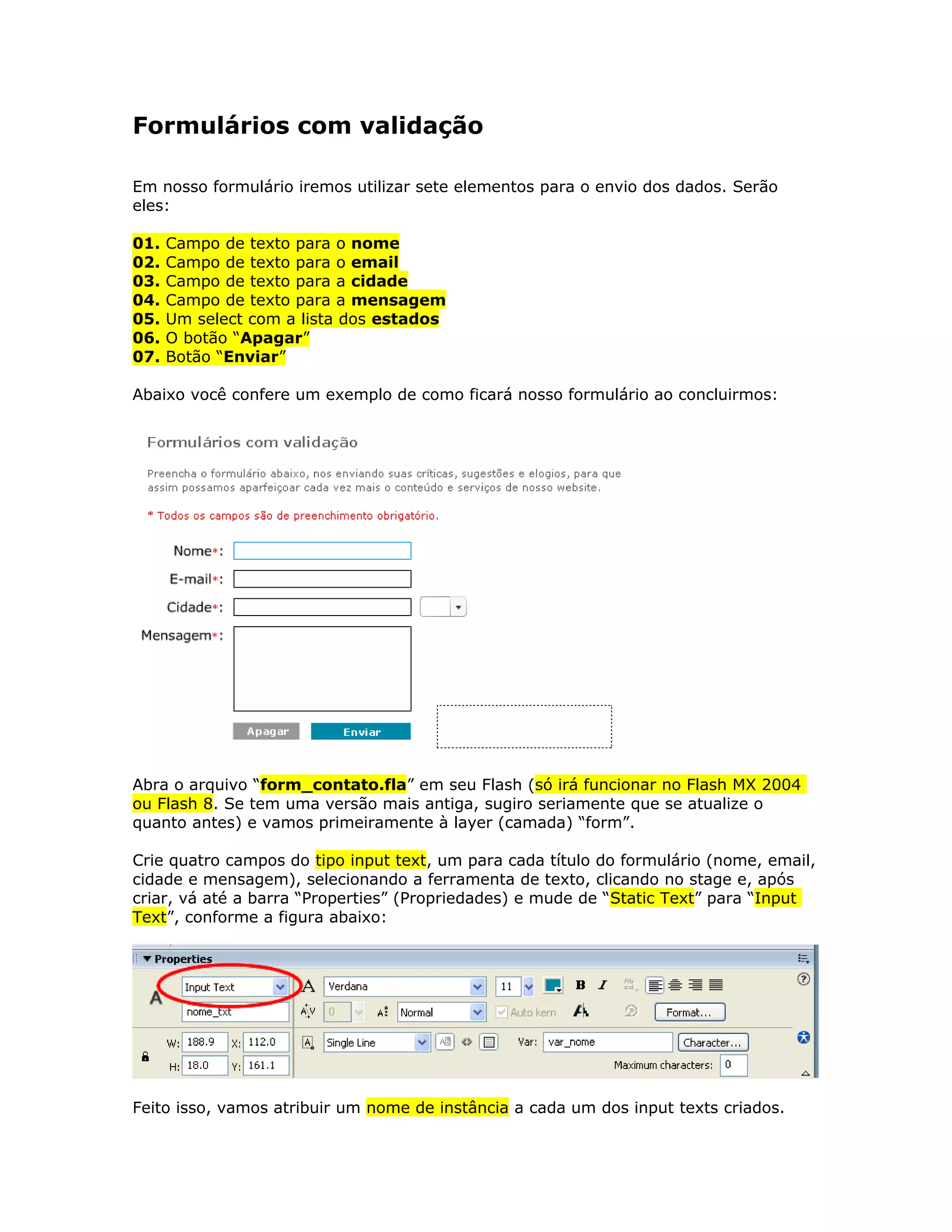 O documento descreve como criar um formulário de contato no Flash com validação de dados, listando os campos necessários e instruindo passo a passo como adicioná-los, nomeá-los, criar botões e validar os dados antes do envio.