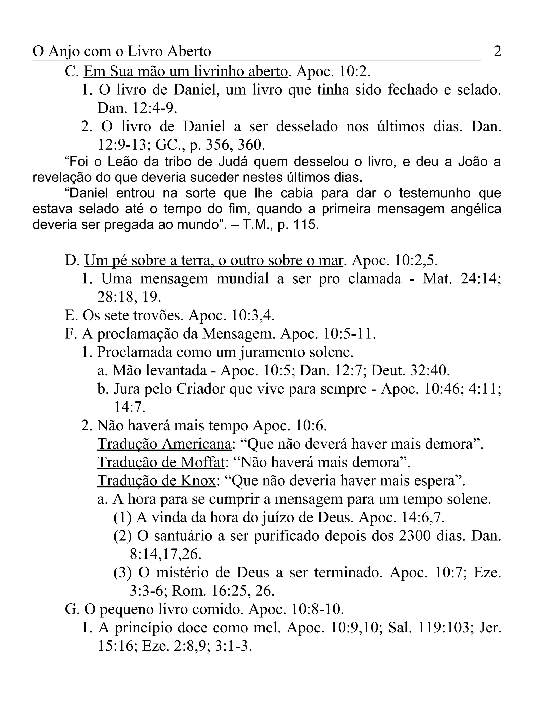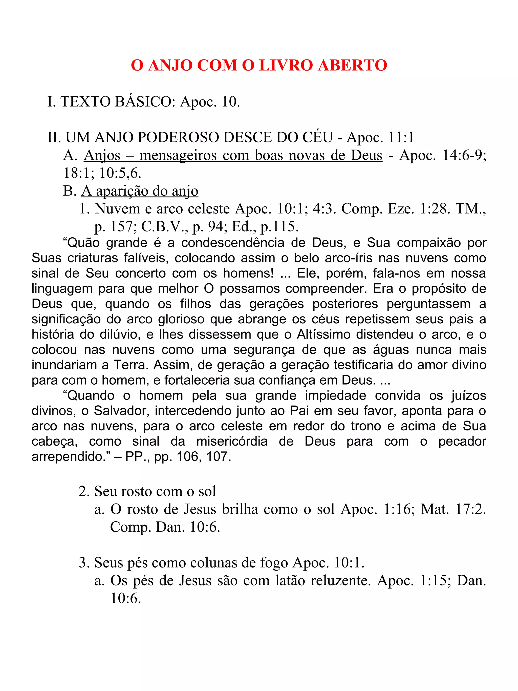 Este documento descreve a visão de João no Apocalipse de um poderoso anjo descendo do céu com um livrinho aberto em sua mão. O anjo jura que o mistério de Deus será cumprido e que a mensagem será proclamada para todo o mundo. João come o pequeno livro, que inicialmente é doce mas depois amargo, e recebe a ordem de profetizar novamente.