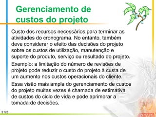 O documento descreve os processos de gerenciamento de custos de projetos segundo o guia PMBOK: (1) Planejar a gestão dos custos, (2) Estimar custos, (3) Determinar o orçamento e (4) Controlar custos. O objetivo é estimar, monitorar e controlar os custos do projeto ao longo de seu ciclo de vida.