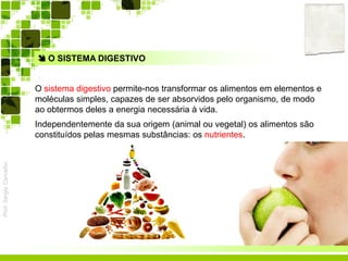 O documento descreve o sistema digestivo humano, explicando que ele transforma os alimentos em nutrientes que podem ser absorvidos pelo organismo. Detalha os principais nutrientes presentes nos alimentos e as estruturas do sistema digestivo e suas funções na digestão dos alimentos.