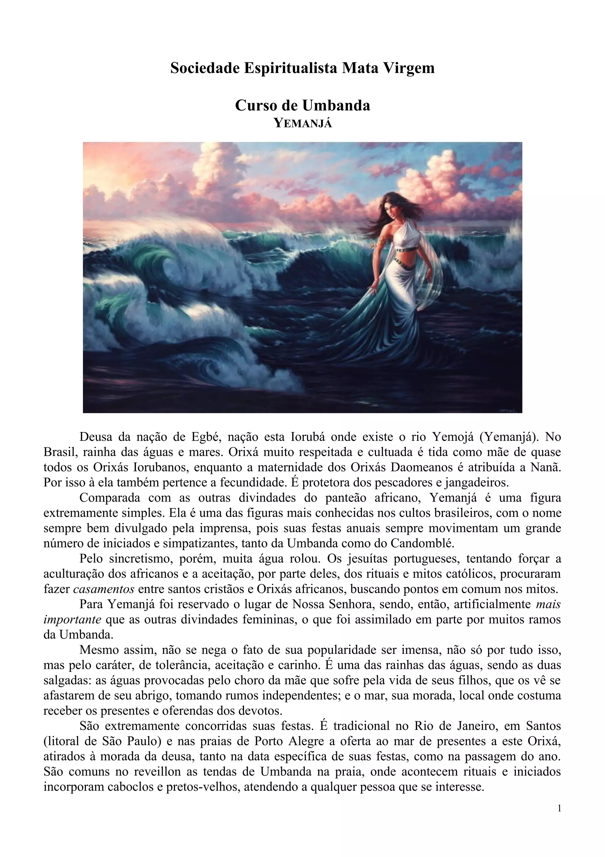 Yemanjá é a deusa das águas e mares no Brasil, mãe de quase todos os orixás. Ela é extremamente popular nos cultos brasileiros e protege os pescadores. Embora tenha sido comparada a Nossa Senhora pelos jesuítas, Yemanjá tem o caráter de tolerância, aceitação e carinho.