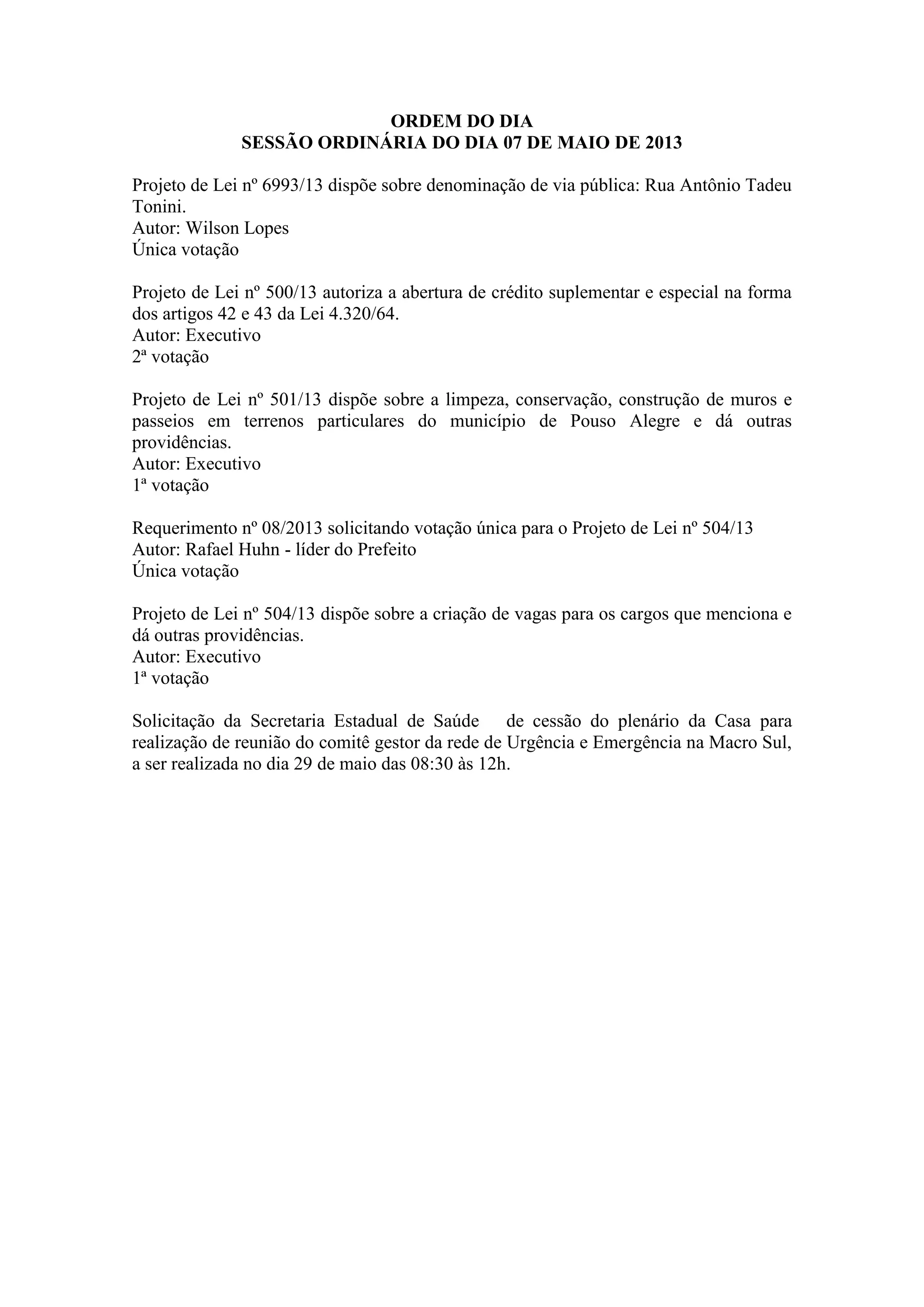A ordem do dia da sessão ordinária de 07 de maio de 2013 inclui a votação de projetos de lei sobre denominação de rua, crédito suplementar, limpeza de terrenos particulares, criação de vagas e cessão do plenário para reunião de saúde.