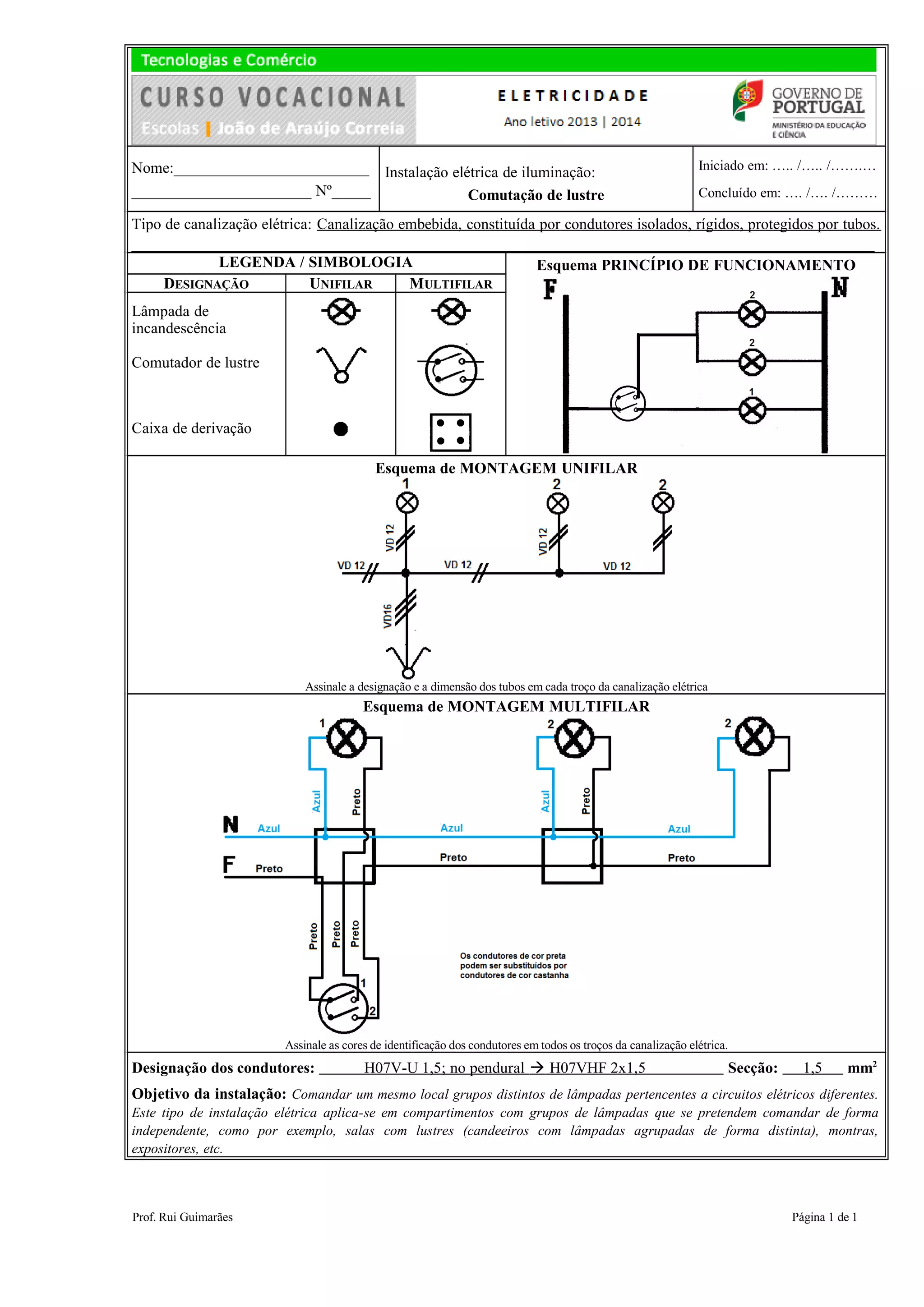 Este documento descreve uma instalação elétrica de iluminação com comutação de lustre. Ele fornece detalhes sobre o tipo de canalização elétrica usada, a simbologia do esquema, o princípio de funcionamento e o objetivo da instalação de permitir controlar grupos separados de lâmpadas em circuitos elétricos diferentes.