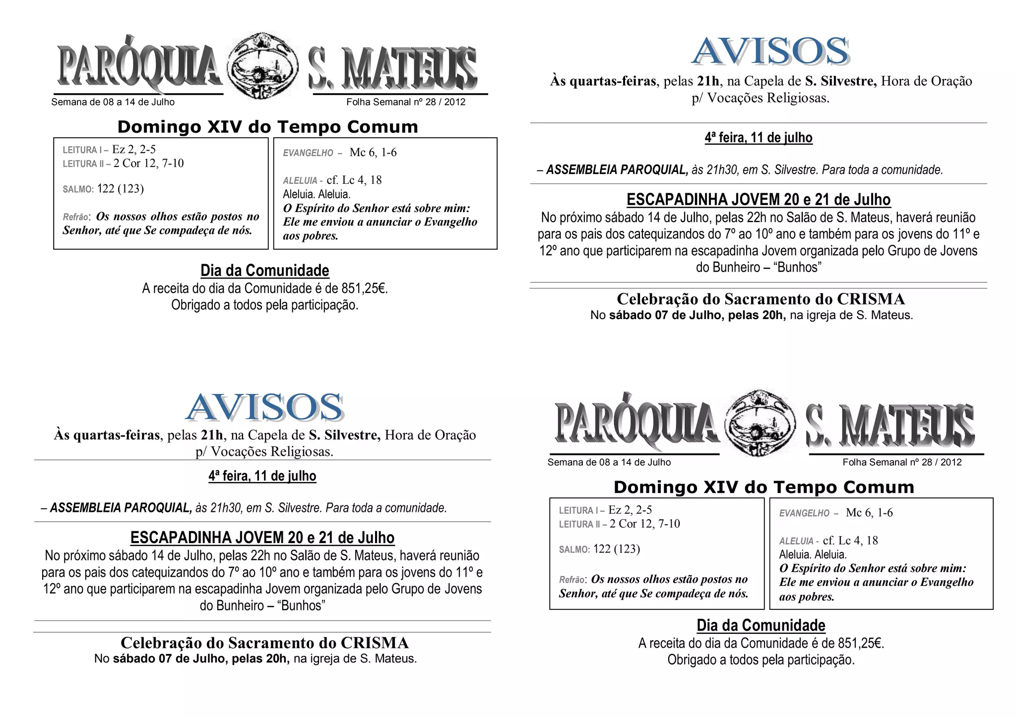 – ASSEMBLEIA PAROQUIAL, às 21h30, em S. Silvestre. Para toda a comunidade. LEITURA I – Ez 2, 2-5 EVANGELHO – Mc 6, 1-6