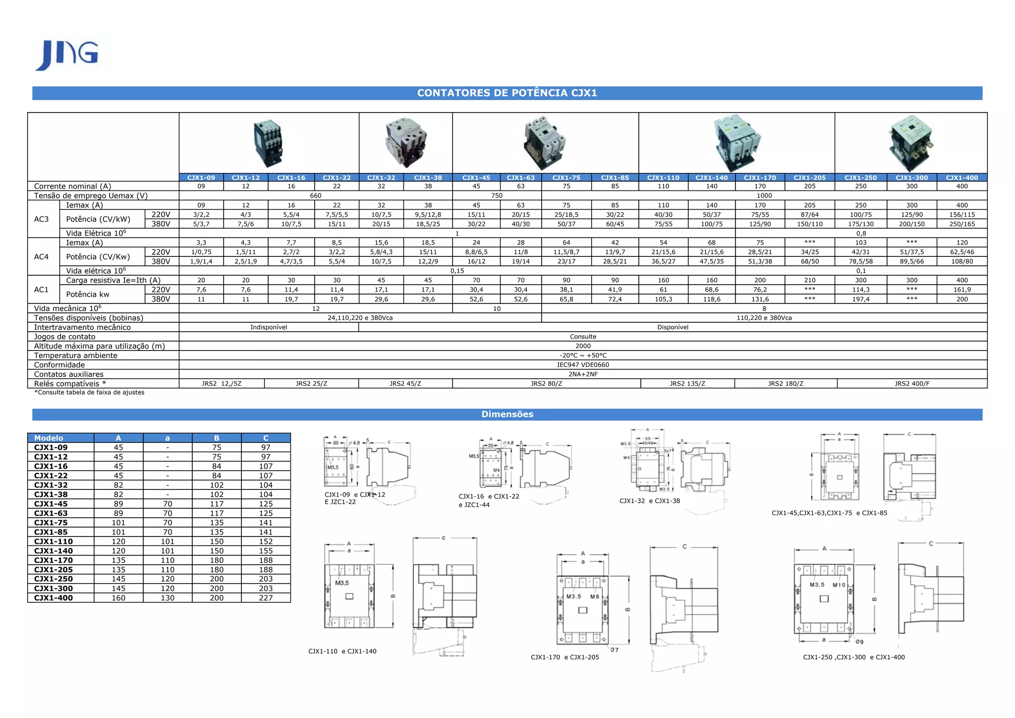 Este documento fornece especificações técnicas para uma linha de contatores de potência CJX1 em diferentes tamanhos, de 9A a 400A, incluindo corrente nominal, tensão, potência, vida útil, dimensões e relés de sobrecarga compatíveis.