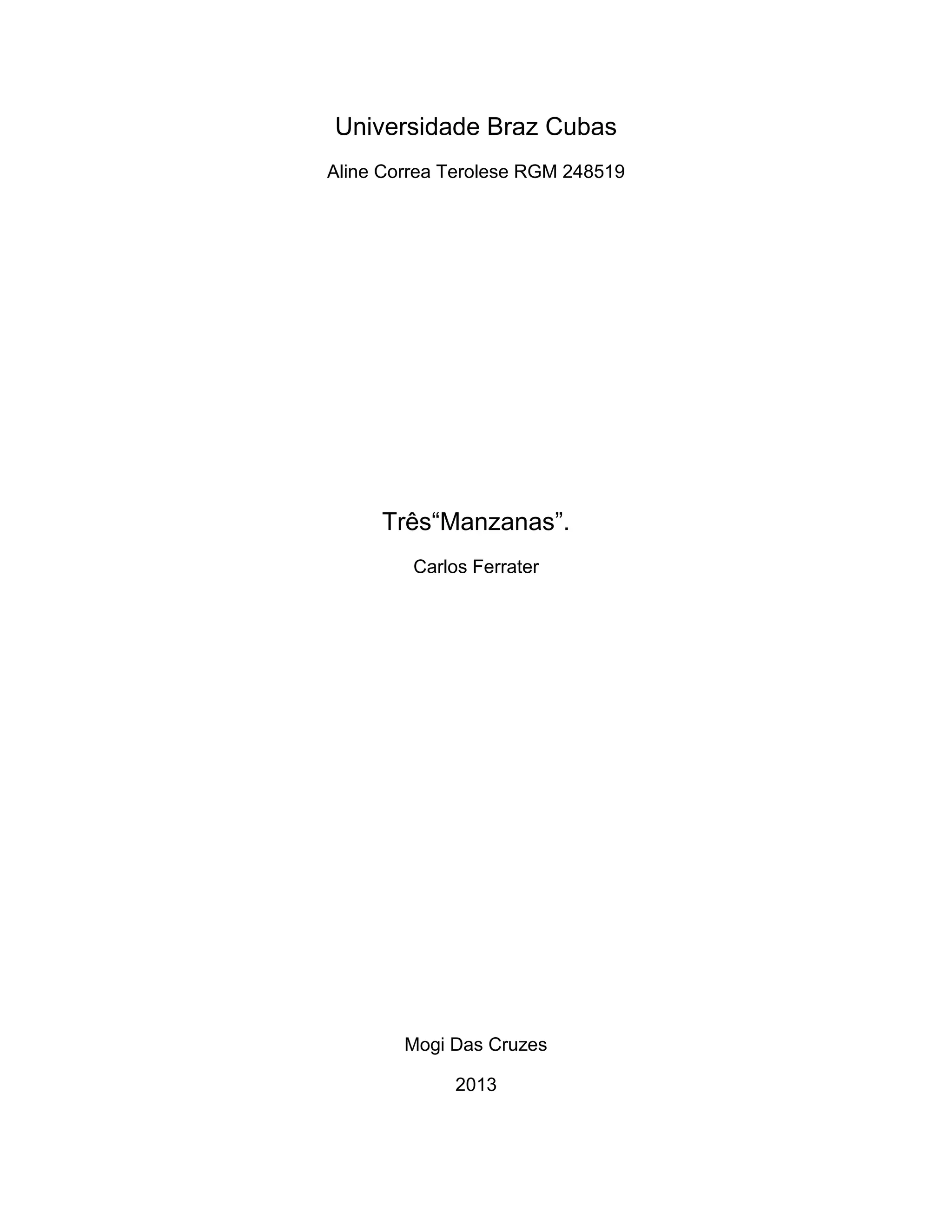 O documento descreve o trabalho do arquiteto Carlos Ferrater, incluindo seus principais projetos como o Jardim Botânico de Barcelona e a sede social da Gisa e FGC. O texto também fornece detalhes sobre três "manzanas" projetadas por Ferrater para as Olimpíadas de 1992 em Barcelona, com apartamentos de diferentes tamanhos e um centro comercial.