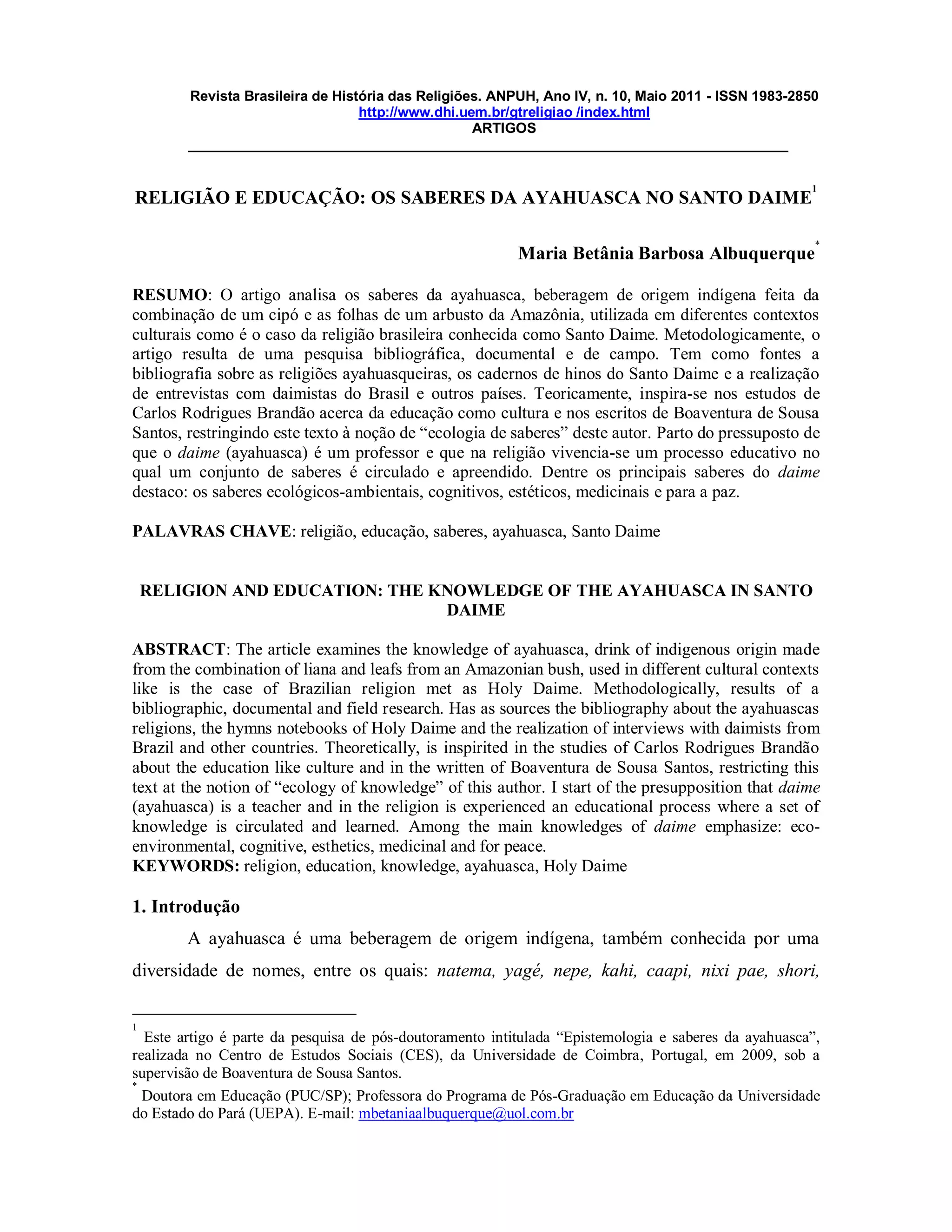 O documento discute os saberes transmitidos pela bebida ayahuasca na religião brasileira Santo Daime. A autora argumenta que a religião promove um processo educativo no qual diversos tipos de conhecimento são compartilhados e aprendidos, incluindo saberes ecológicos, cognitivos, estéticos, medicinais e para a paz. A ayahuasca é vista como uma professora espiritual cuja ingestão gera encontros entre diferentes saberes dentro de uma "ecologia de conhecimentos".