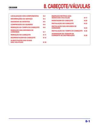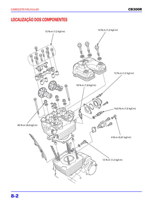 Este documento fornece instruções para serviços relacionados ao cabeçote e às válvulas de um motor, incluindo localização de componentes, especificações técnicas, ferramentas necessárias, diagnóstico de defeitos e procedimentos para teste de compressão, remoção e instalação de peças.