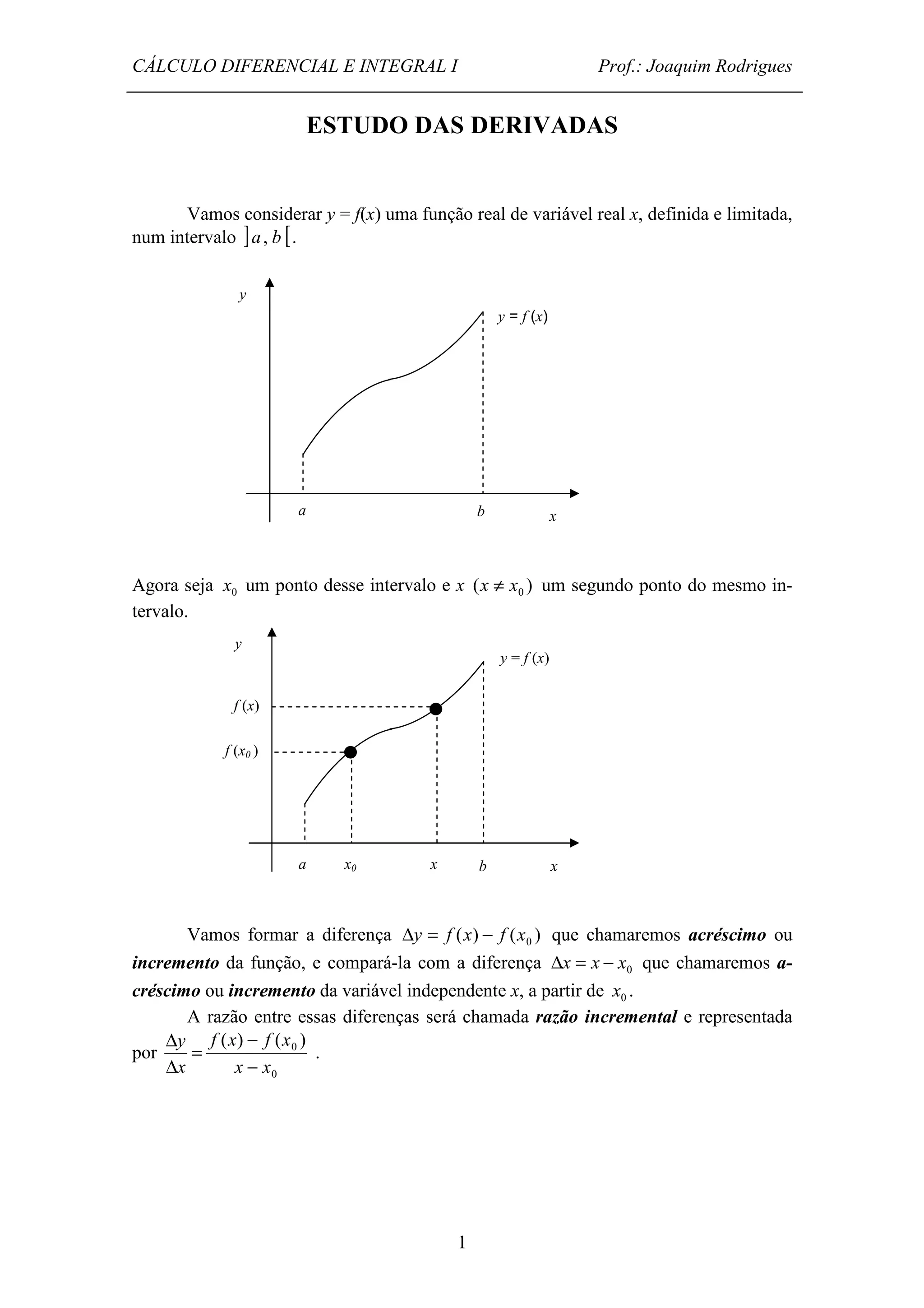 O documento discute o conceito de derivada de funções. Apresenta a definição formal de derivada como o limite da razão incremental de uma função quando o incremento da variável independente tende a zero. Fornece exemplos de cálculo de derivadas de funções simples e introduz regras básicas para derivação de funções algébricas.