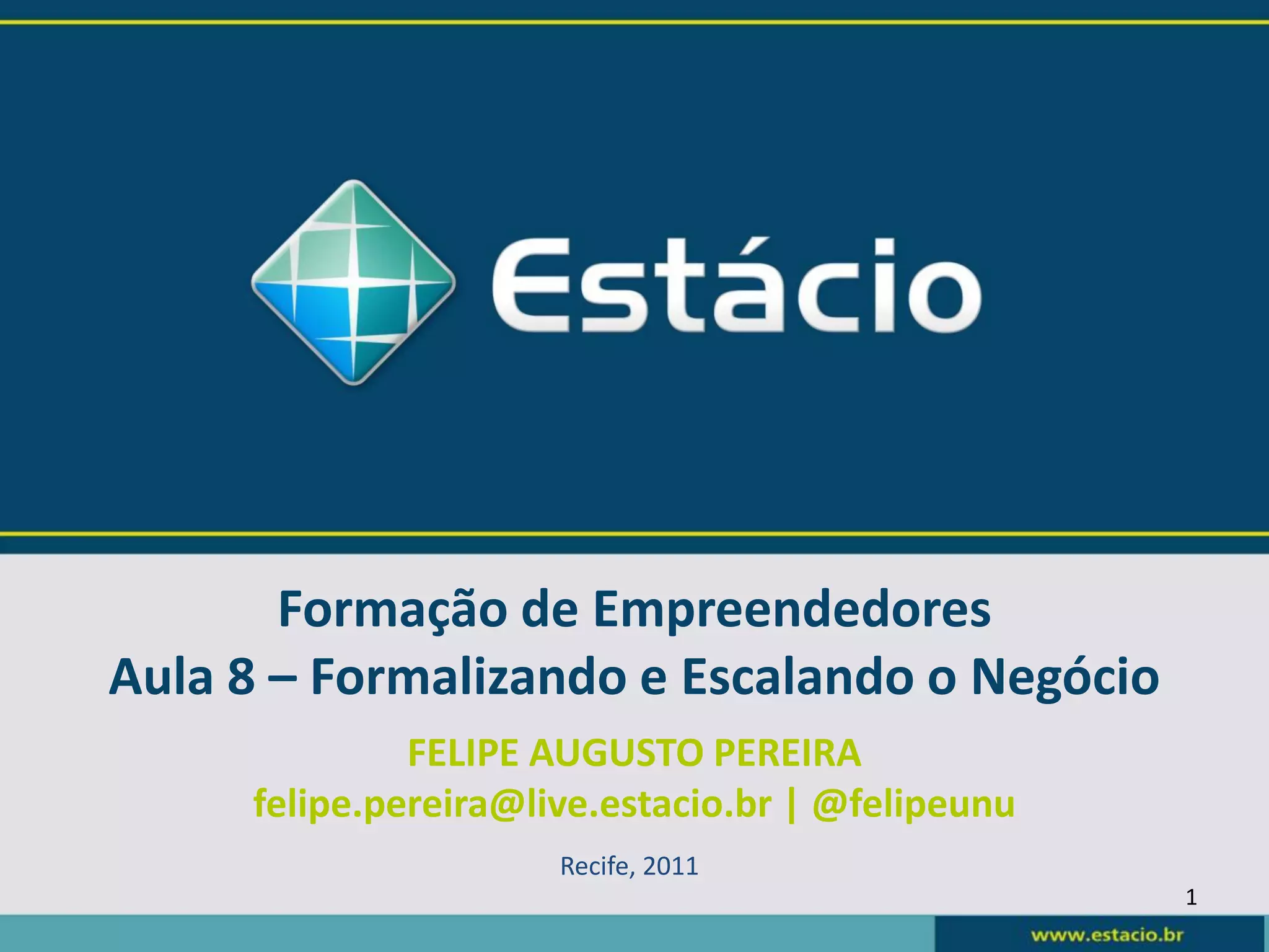 O documento discute formalização e crescimento de negócios. Ele explica formas de financiamento como capital próprio, empréstimos e investidores; formas jurídicas como MEI, EI, LTDA e SA; e o processo de abertura de empresa, incluindo consulta prévia, registro, CNPJ, alvará e INSS.