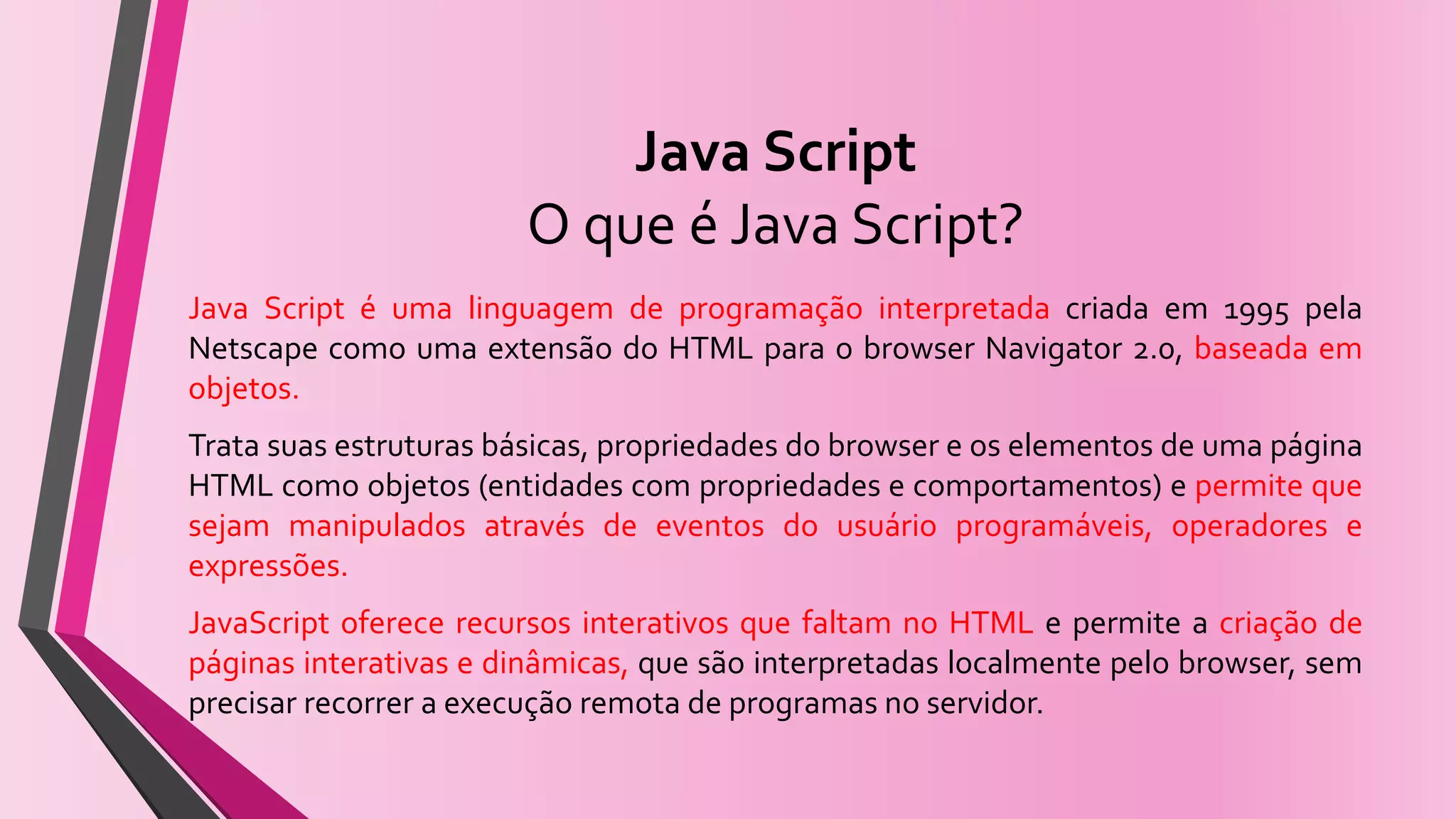 O documento descreve o que é JavaScript, suas principais características e diferenças em relação à linguagem Java. JavaScript é uma linguagem de programação interpretada usada para criar páginas Web dinâmicas e interativas, executada localmente pelo navegador sem necessidade de comunicação com o servidor.