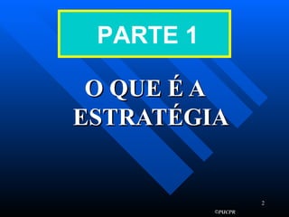Este documento discute conceitos e níveis de estratégia, além de apresentar ferramentas como análise SWOT e de forças competitivas de Porter. A estratégia é definida como ações para alcançar objetivos de longo prazo, enquanto a administração estratégica sistematiza o ambiente externo e planejamento interno da organização.