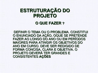 O QUEFAZER ? DEFINIR O TEMA OU O PROBLEMA. CONSTITUI O ENUNCIADO DA AÇÃO, OQUE SE PRETENDE FAZER AO LONGO DO ANO OU EM PERÍODOS MAIORES PARA ATINGIR OS OBJETIVOS DO ANO EM CURSO. DEVE SER REDIGIDO DE FORMA CONCISA, CLARA E OBJETIVA. O PROJETO DEVERÁ TER GRANDES E CONSISTENTES AÇÕES ESTRUTURAÇÃO DO PROJETO