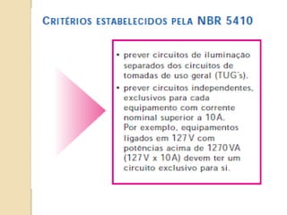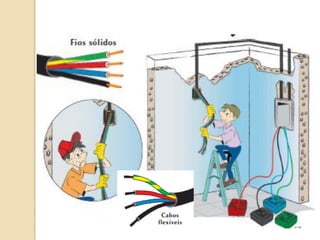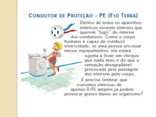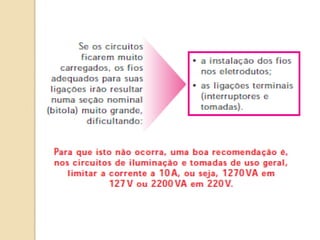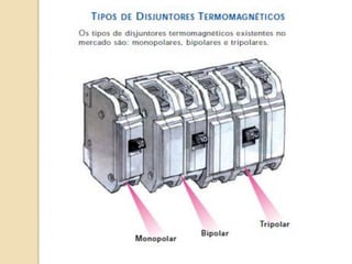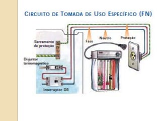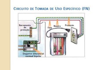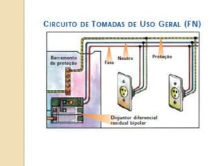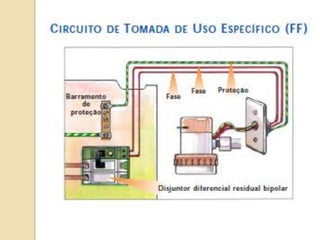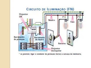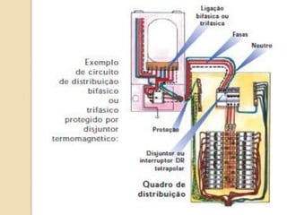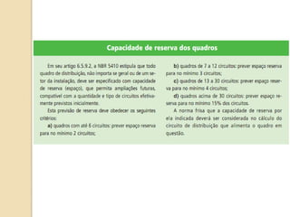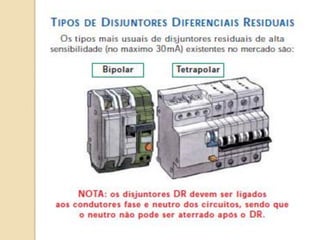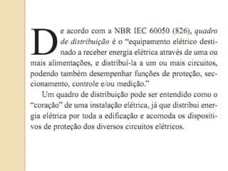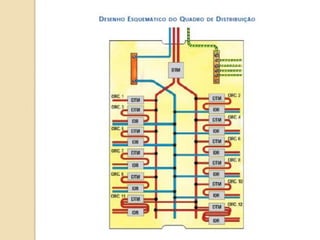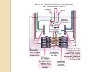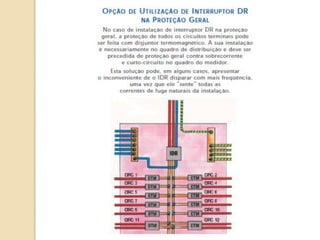 1) O documento discute quadros de distribuição elétrica, incluindo o que é um quadro de distribuição, a melhor localização e componentes como disjuntores. 2) Aborda questões como os tipos de fios e cabos elétricos utilizados, a função de disjuntores termo magnéticos e diferenciais residuais. 3) Discutem requisitos como conectar o neutro após o disjuntor diferencial residual e instalar interruptores diferenciais residuais com outros dispositivos.