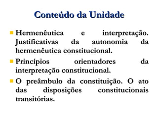 Este documento discute princípios orientadores da interpretação constitucional no Brasil. Ele explica que a Constituição deve ser interpretada de acordo com sua supremacia, unidade e máxima eficácia. Além disso, a interpretação deve ser conforme a Constituição, com presunção de constitucionalidade de leis, buscando harmonizar normas aparentemente antinômicas.