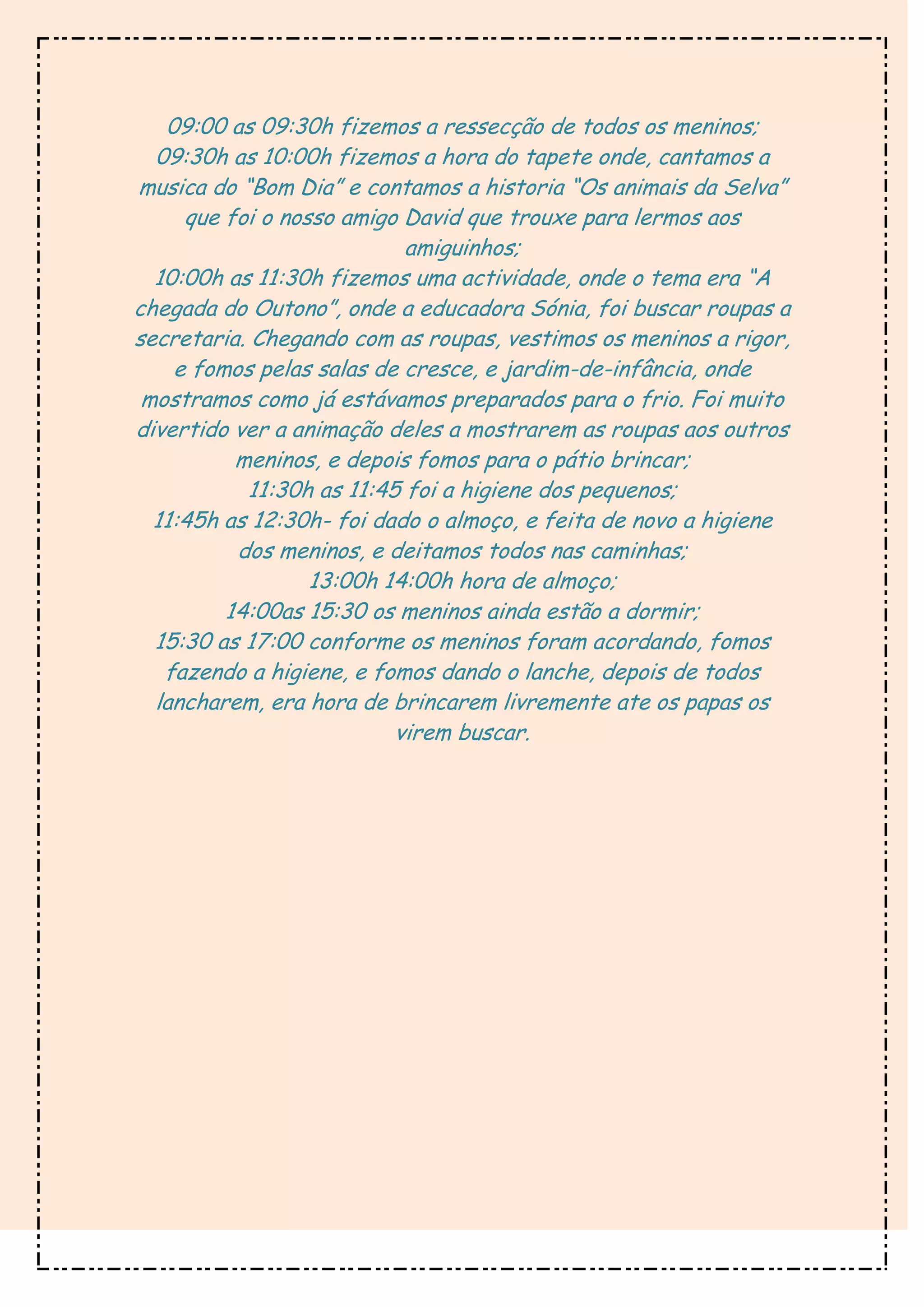 A educadora descreve as atividades diárias na creche de 09:00 às 17:00, incluindo cantar músicas, contar histórias, vestir as crianças para o outono, brincadeiras no pátio, almoço, sesta e lanche.