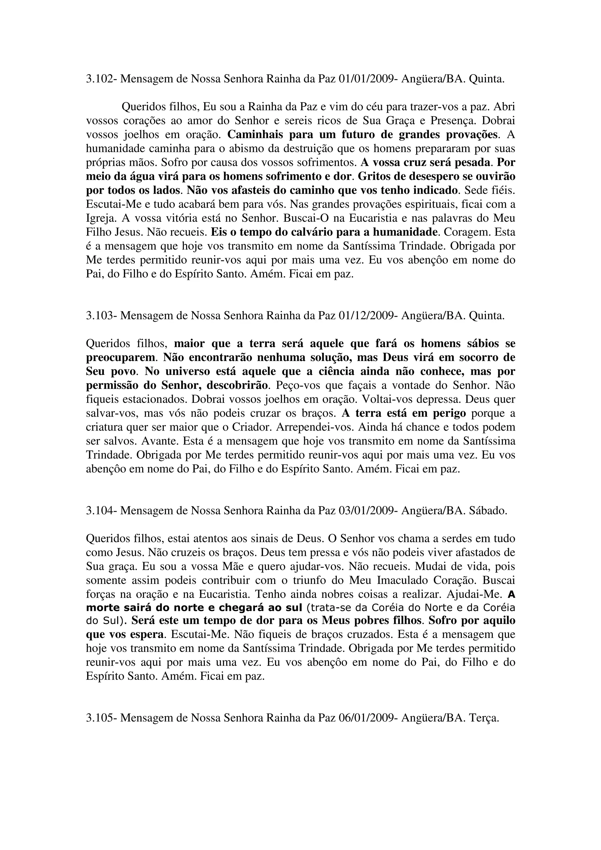 Nas mensagens, Nossa Senhora descreve um futuro de grandes provações e sofrimentos para a humanidade, incluindo desastres naturais causados por incêndios no interior da terra e pela colisão de dois objetos celestes. Ela pede aos fiéis que se convertam, oremem e sigam os seus ensinamentos para encontrarem a paz e a salvação.