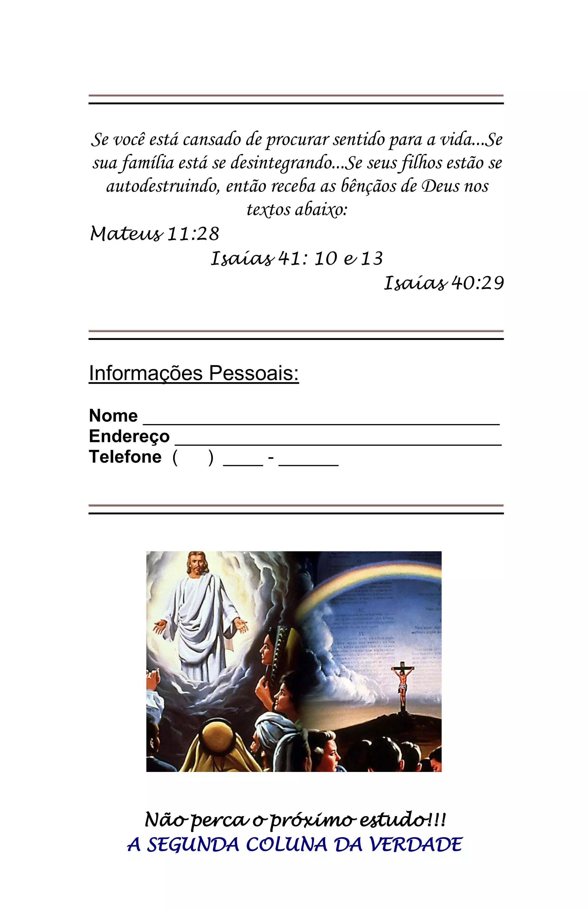 Este documento convida as pessoas a participarem de um estudo bíblico sobre o Apocalipse, prometendo respostas para problemas da vida. Ele ensina que Deus é a única entidade digna de adoração e que só Ele pode perdoar pecados. Aconselha as pessoas a buscarem a Deus diretamente através da leitura da Bíblia.
