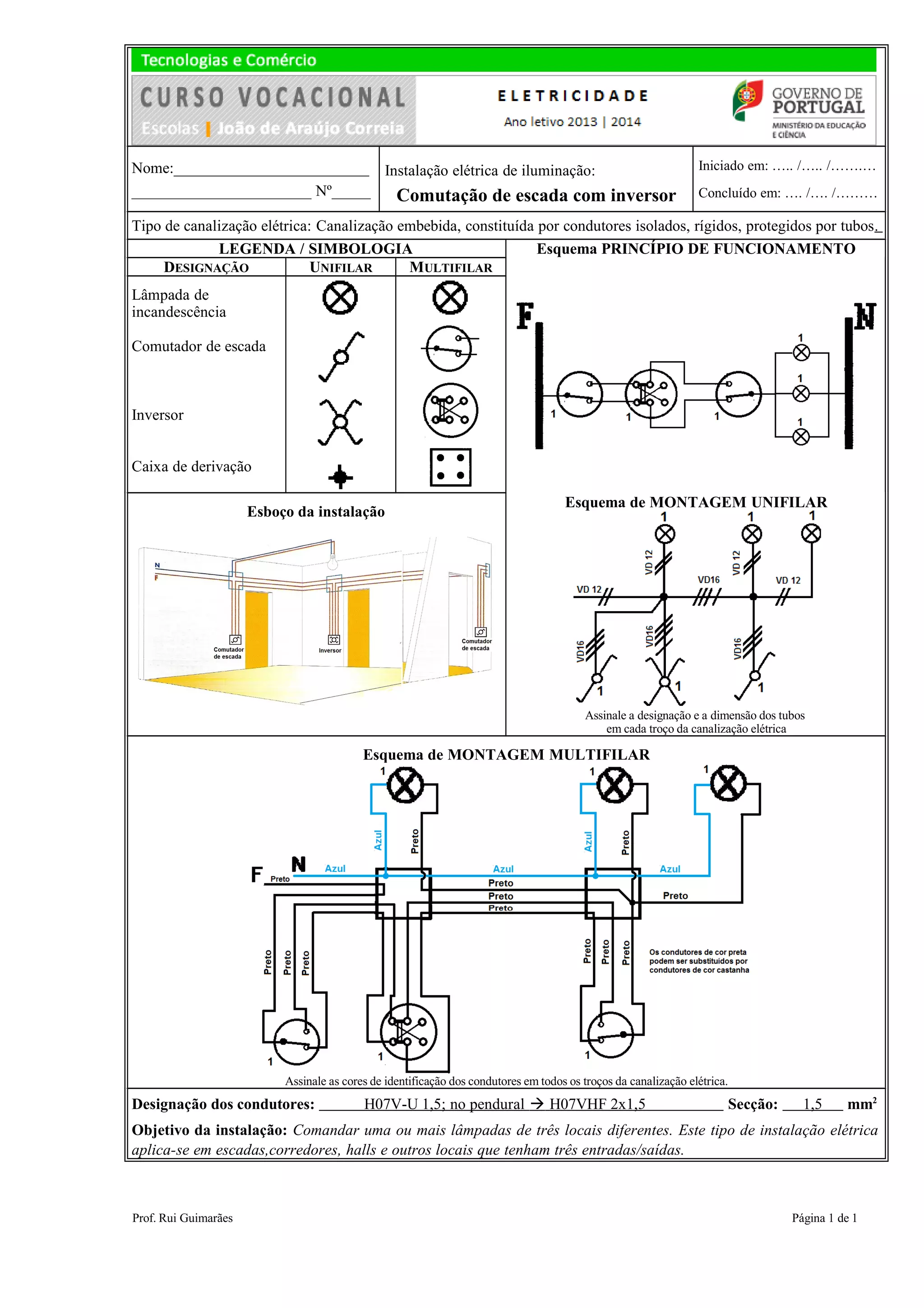O documento descreve uma instalação elétrica de iluminação com comutação de escada, com condutores embutidos em tubos e três pontos de comando. A instalação permite acender uma ou mais lâmpadas de três locais diferentes, como escadas e corredores.