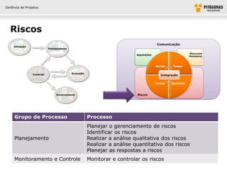 O documento discute os processos de gerenciamento de riscos em projetos. Ele explica que o planejamento de riscos envolve identificar os riscos, analisá-los qualitativamente e quantitativamente, e planejar respostas. A identificação de riscos usa técnicas como brainstorming e análise SWOT para listar riscos. A análise qualitativa prioriza os riscos usando uma matriz de probabilidade e impacto.